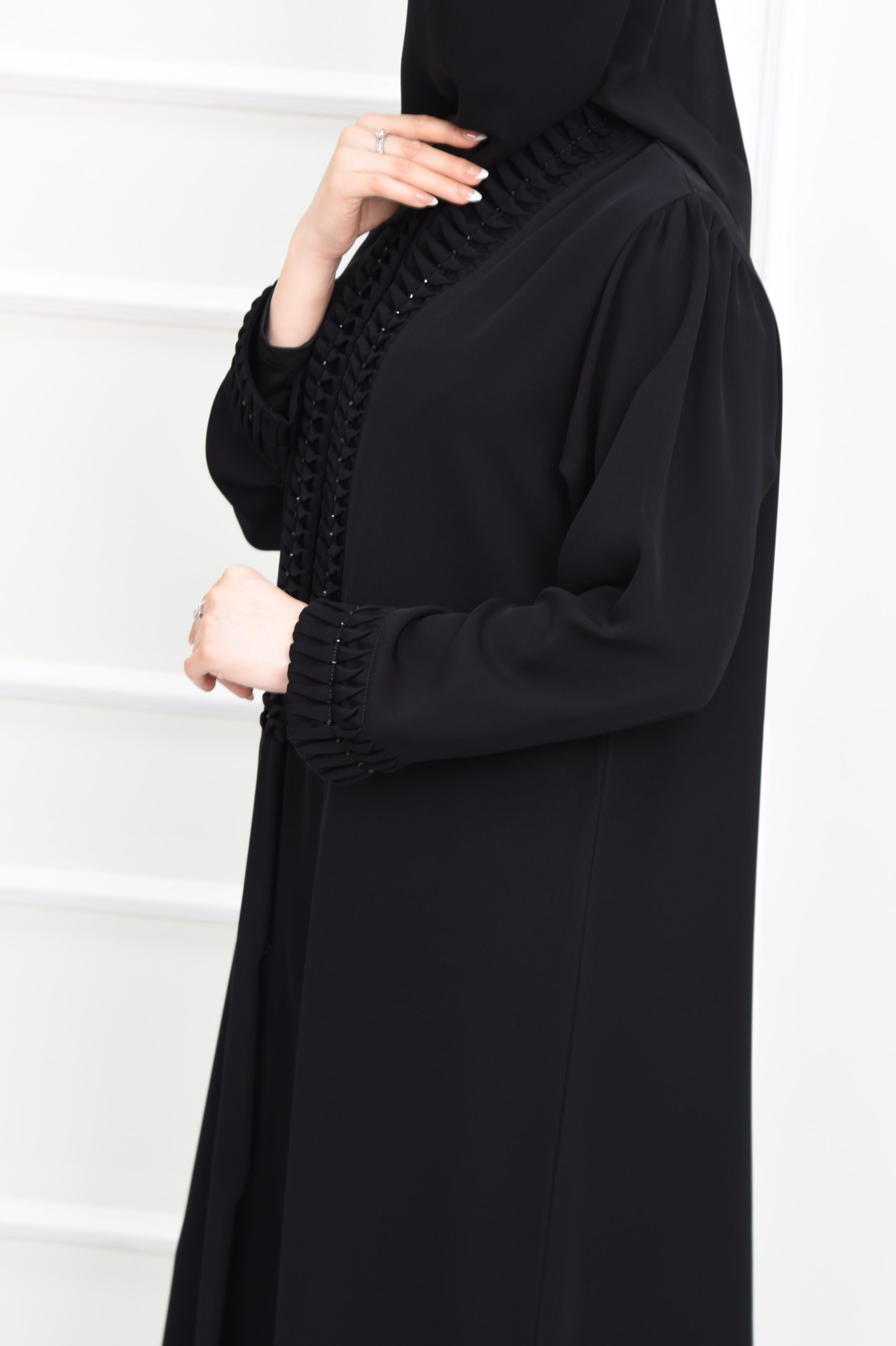 وصف العباية: عباية مناسبات راقية بتصميم مميزاً. تتميز بياقة كسرات حول الرقبة مرصعة بلمسات خرز أنيقة، مع تكرار تفاصيل الكسرات على الأكمام لتكمل جمالية التصميم. ق…
