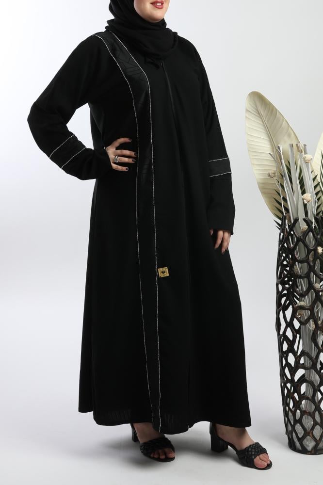 أمول – عباية سودا ء مطرز بخيوط طوليه باشكال متداخله لون ابيض و جالكسي 6058