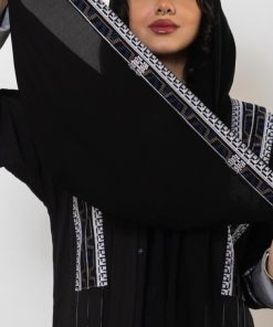 أمول – عباية سودا ء بتطاريز خيوط مقلمة اسود و كحلي ولون اسود دانتيل عروق 6047