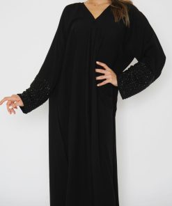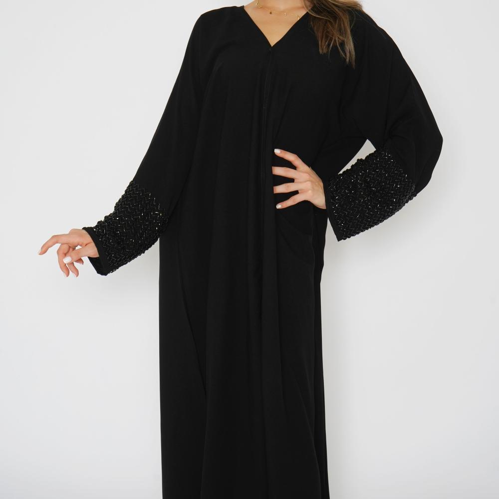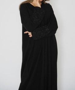 أمول – عباية سودا ء تطريز شك يدوي لون ابيض على شكل ورود 6051