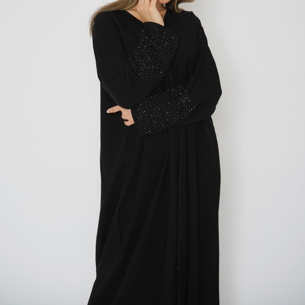 أمول – عباية سوداء بقماش مقلم في الكم والاطراف R1097