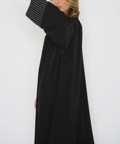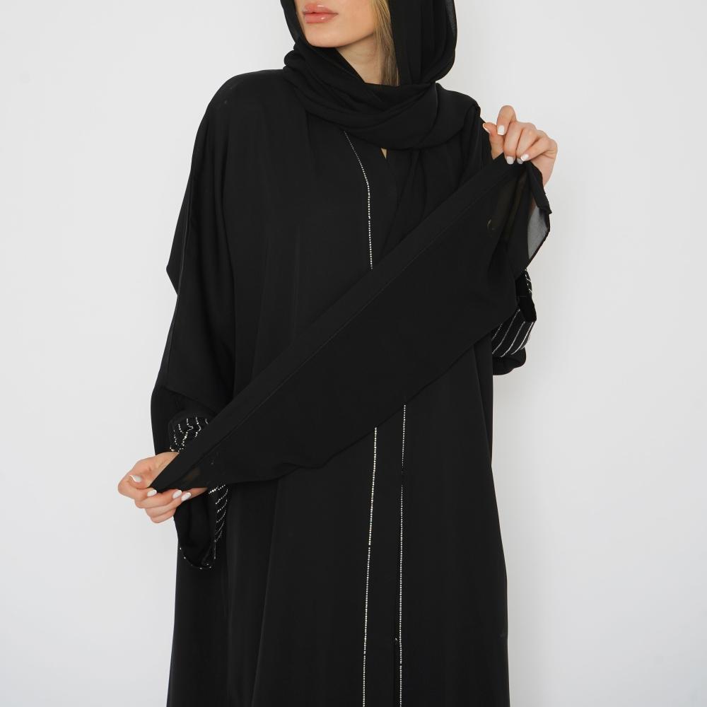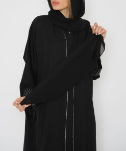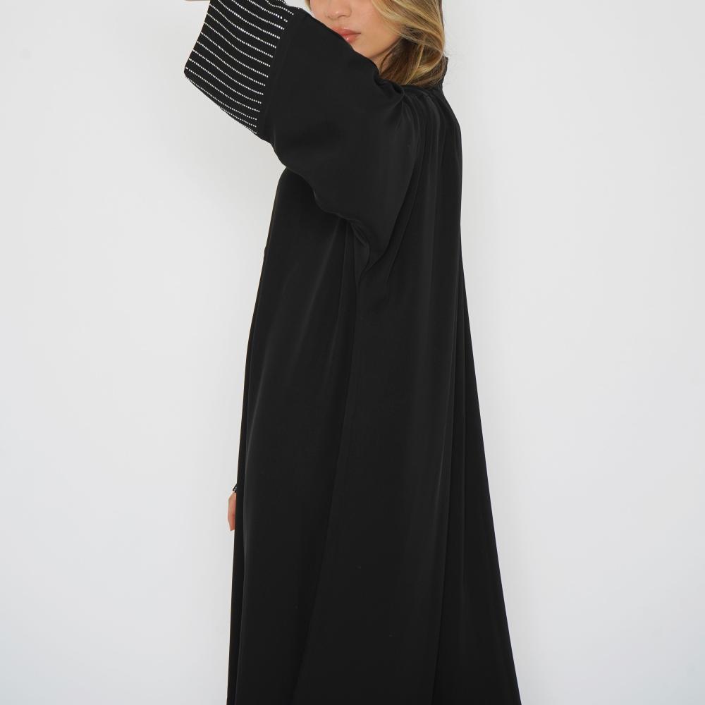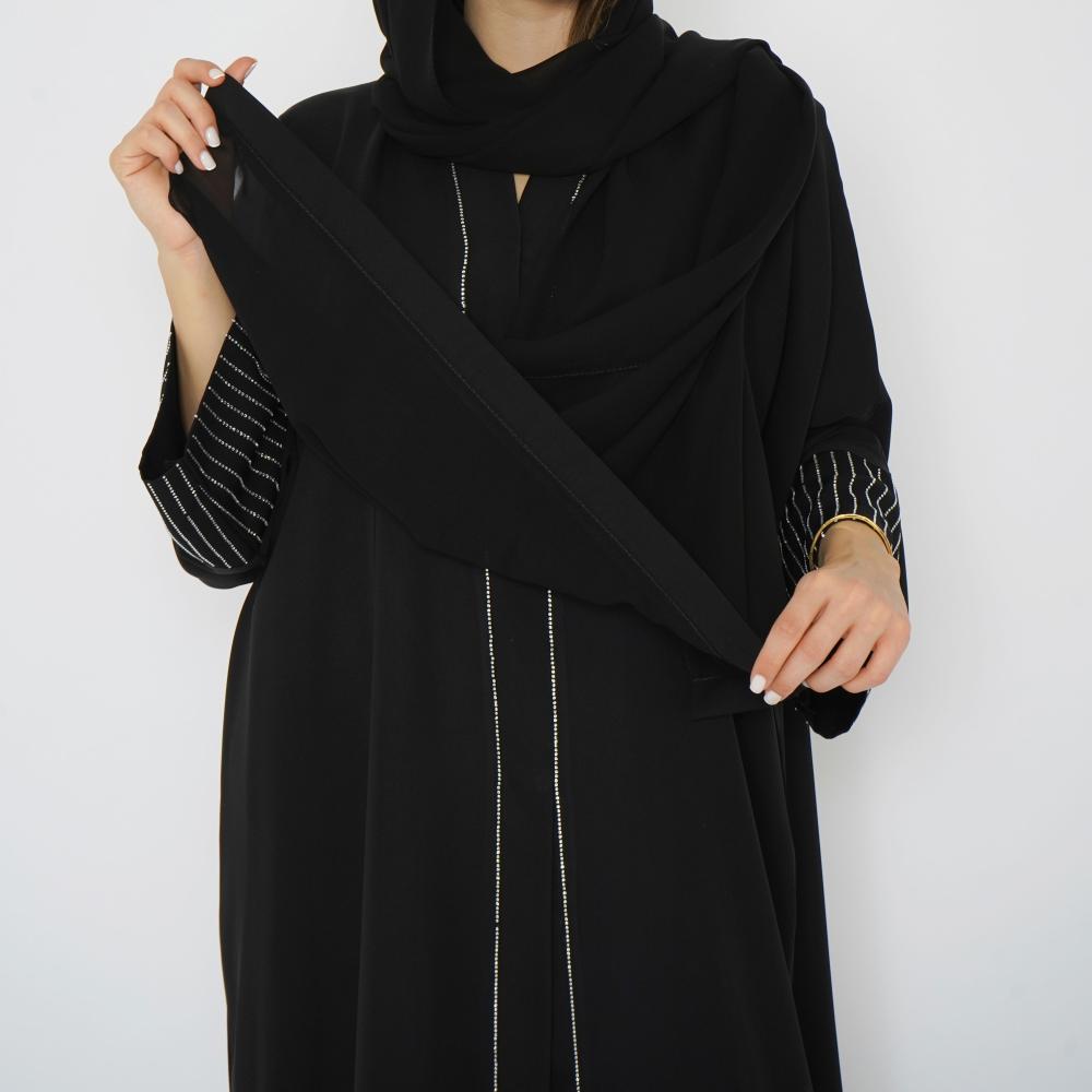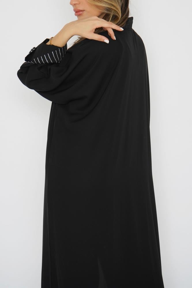 أمول – عباية سوداء بتداخل قماش وفصوص فضية طولية وعلى الكم 5083