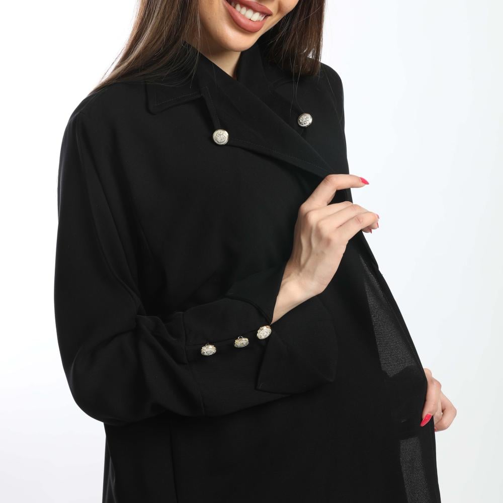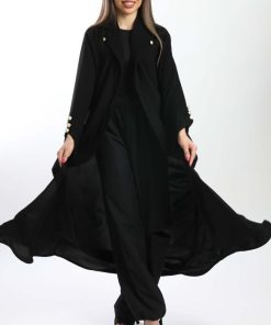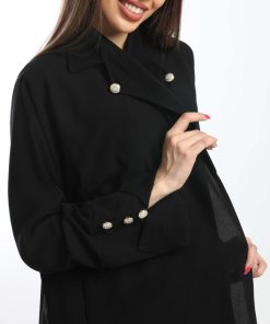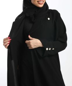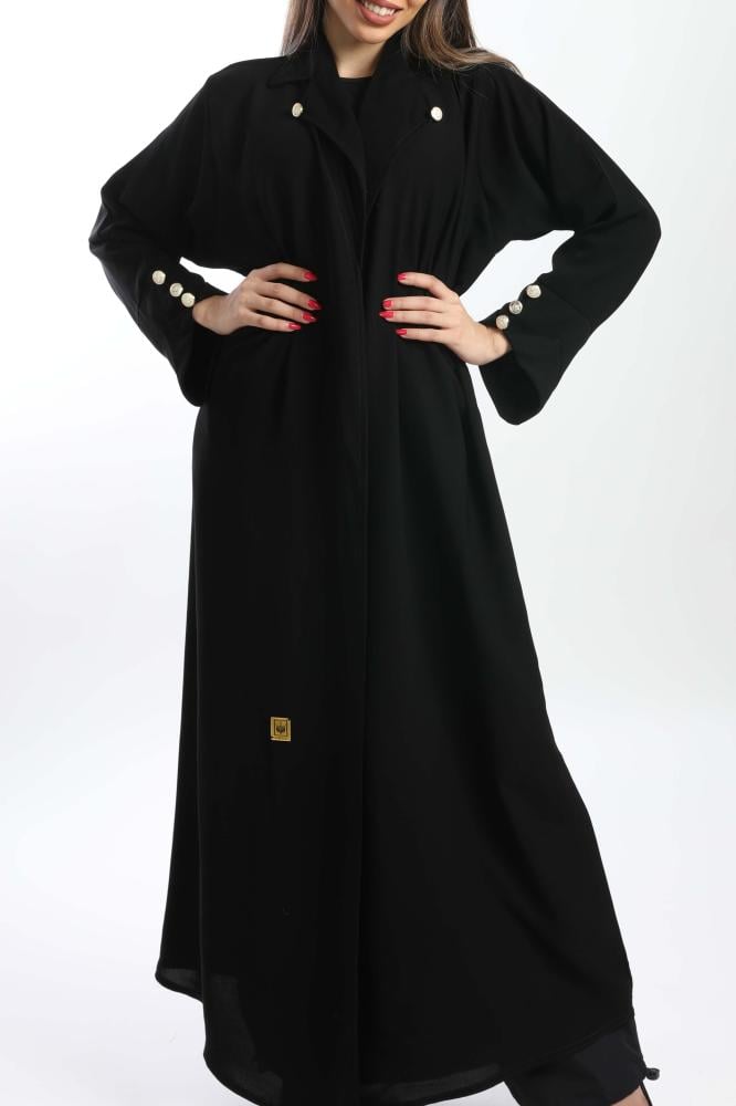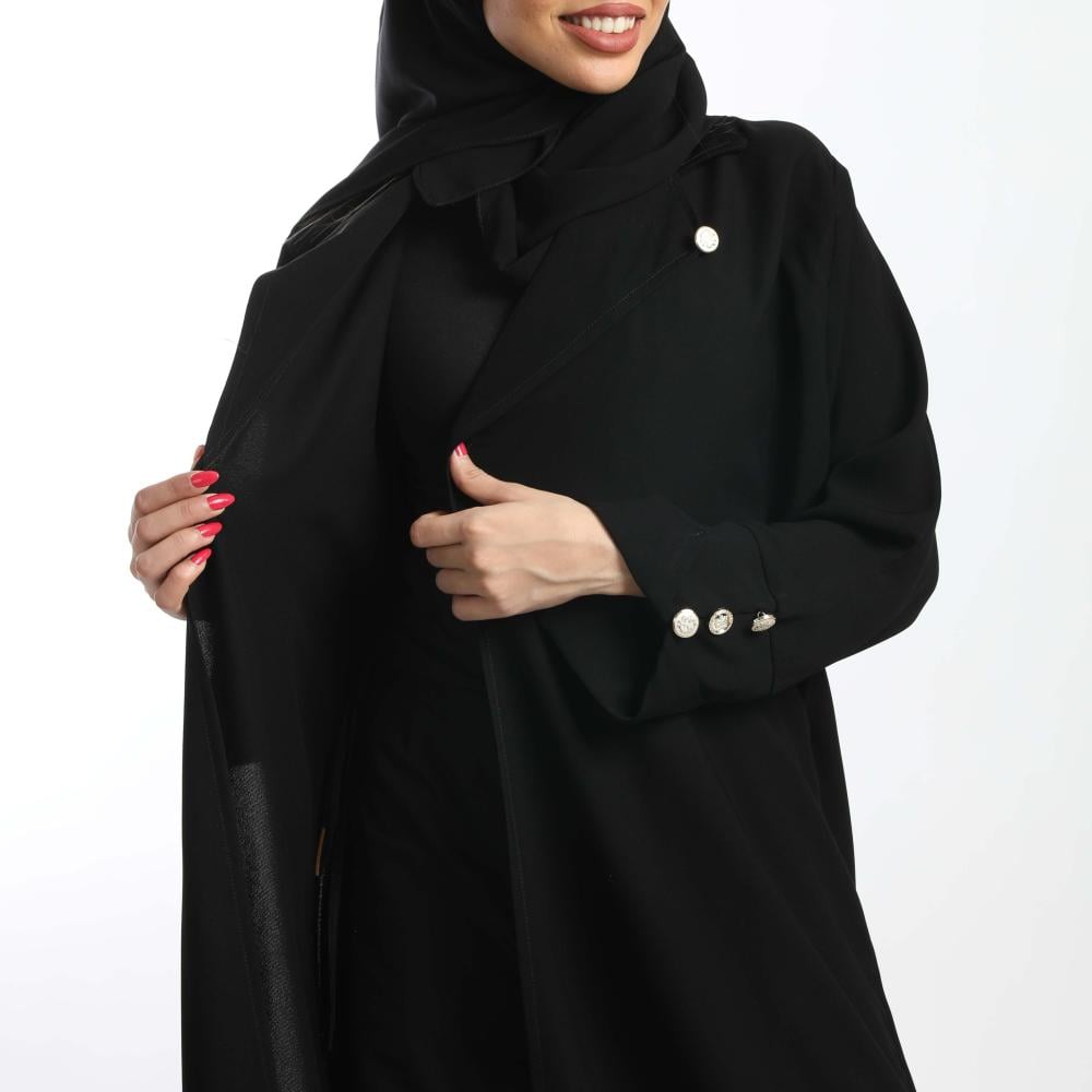 أمول – عباية سوداء بتداخل قماش وفصوص فضية طولية وعلى الكم 5083