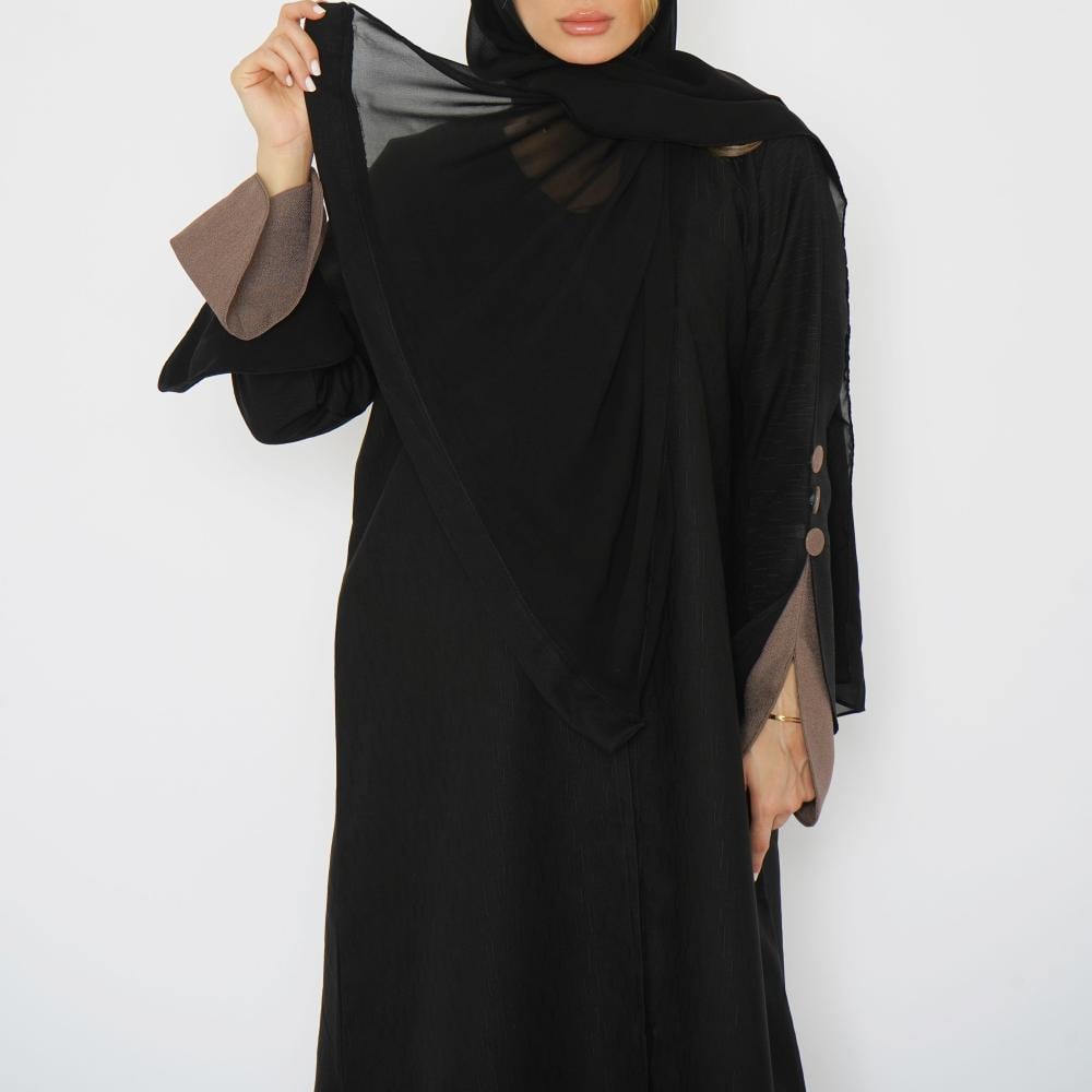 أمول – عباية سوداء بتداخل من قماش مخطط اللون الأبيض 5089