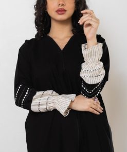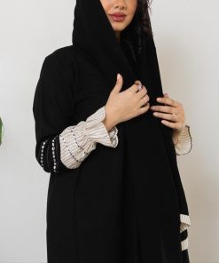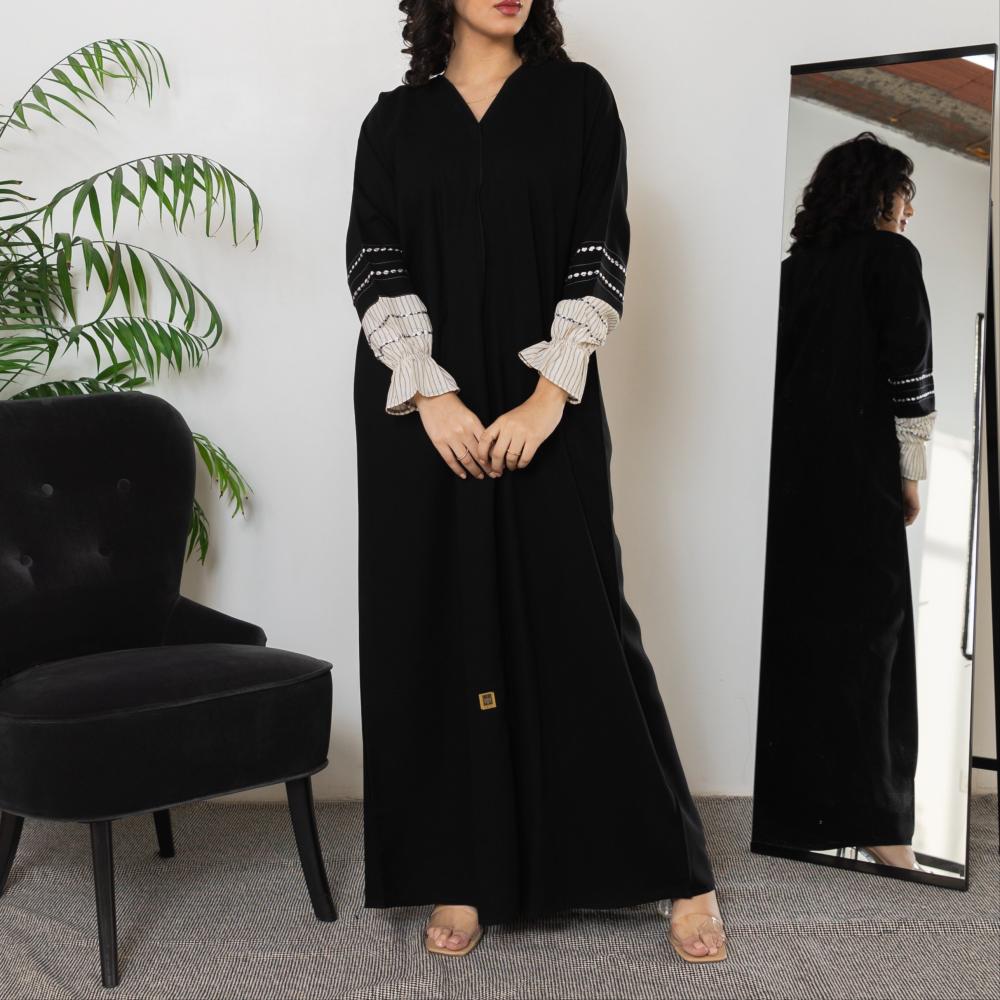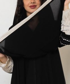 أمول – عباية سوداء بتداخل من قماش مخطط اللون الأبيض 5089