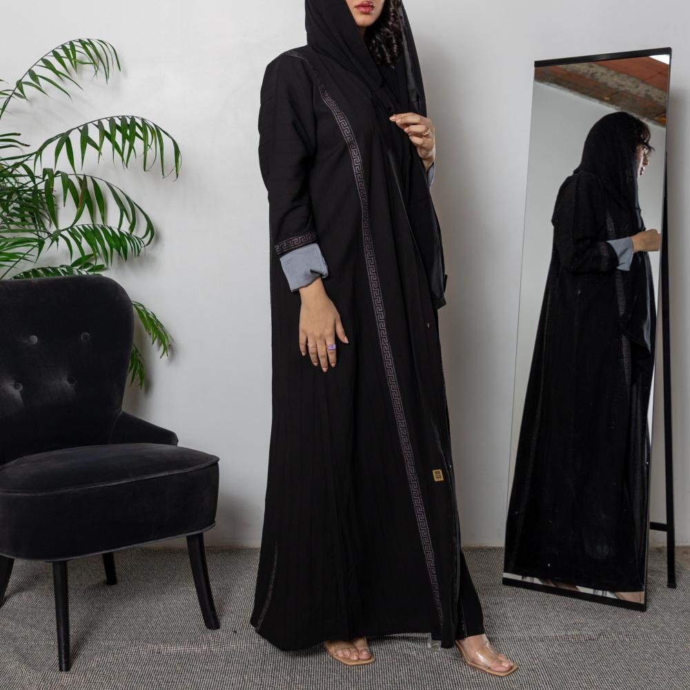 أمول – عباية سوداء بتداخل قماش وفصوص فضية طولية وعلى الكم 5083