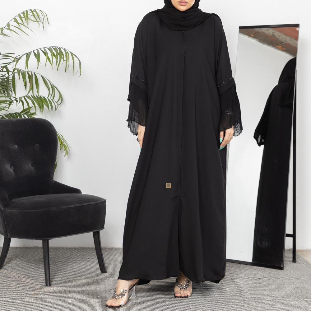 أمول – عباية سوداء بقماش مقلم في الكم والاطراف R1097