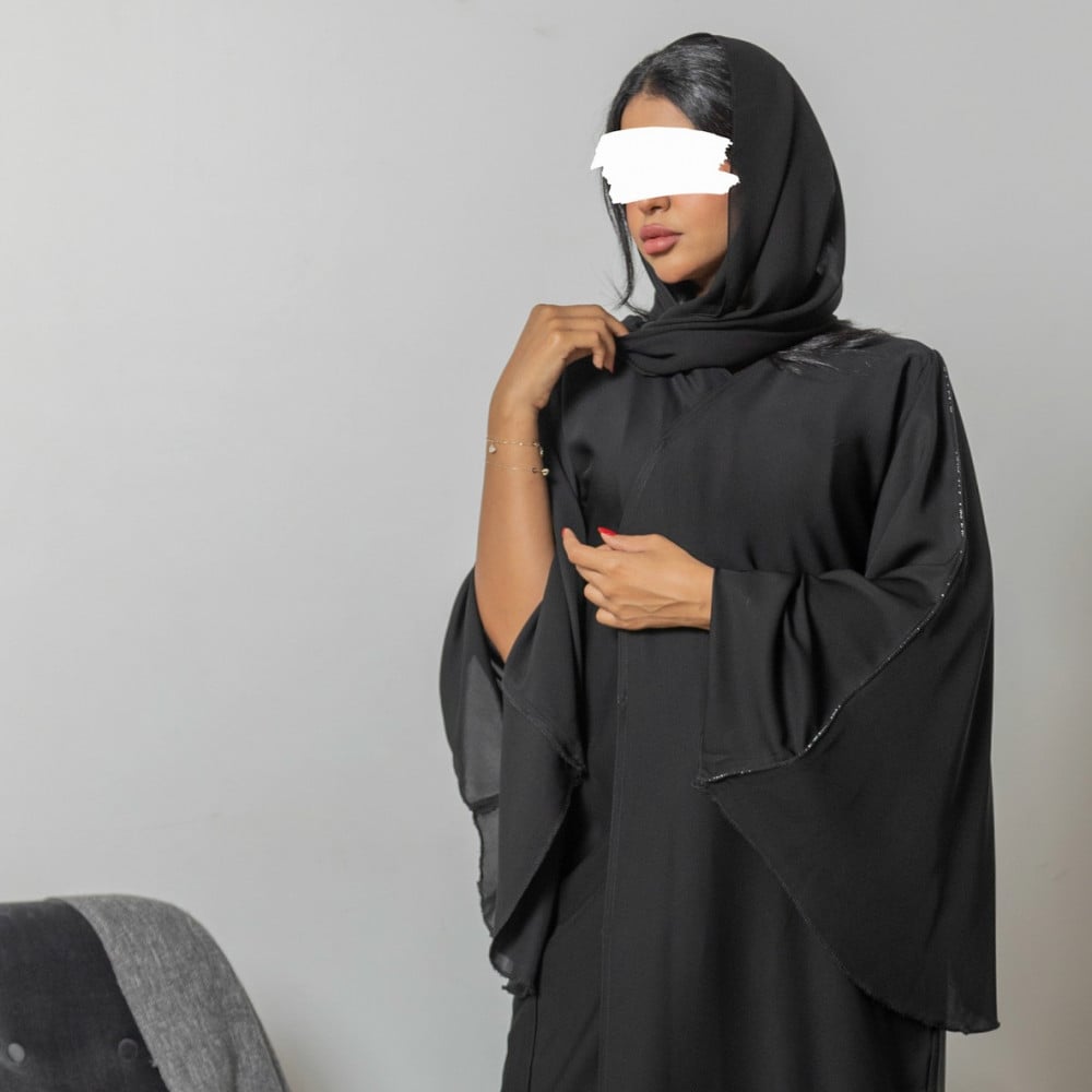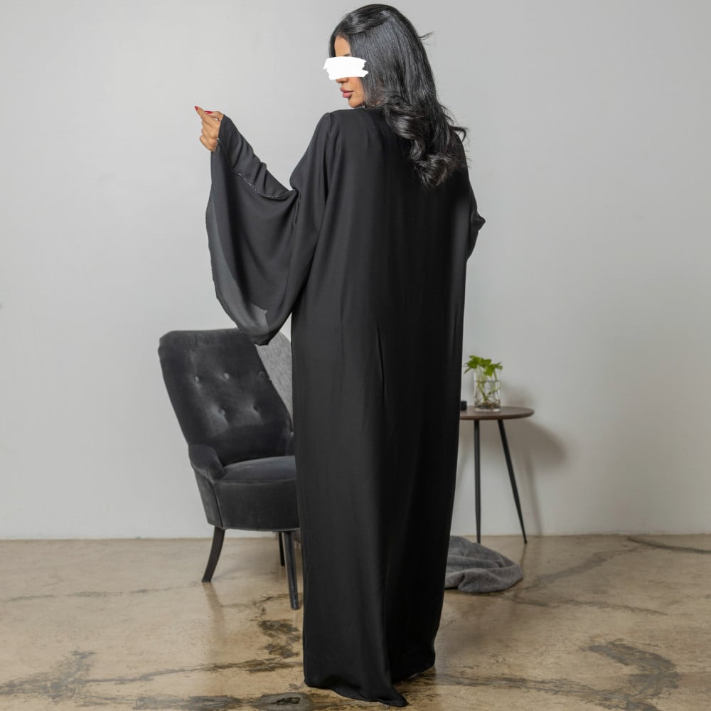 أمول – عباية سوداء بتداخل قماش وفصوص فضية طولية وعلى الكم 5083