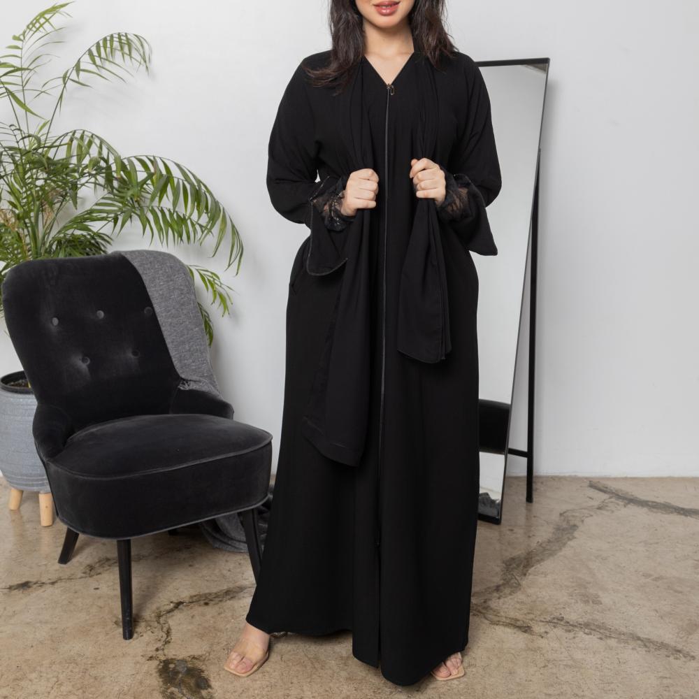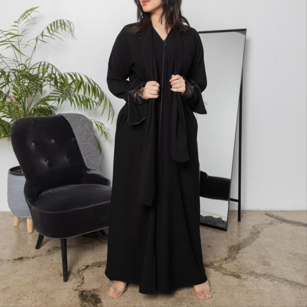أمول – عباية سودا ء بتطاريز خيوط مقلمة اسود و كحلي ولون اسود دانتيل عروق 6047