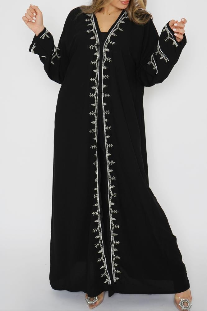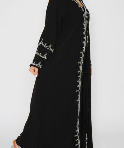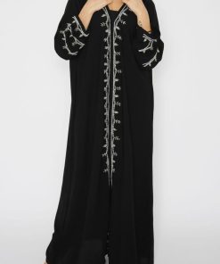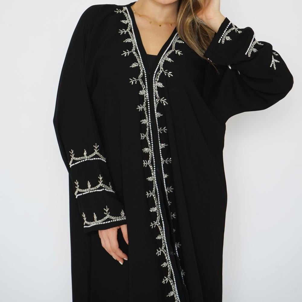 أمول – عباية سودا ء مطرز بخيوط طوليه باشكال متداخله لون ابيض و جالكسي 6058