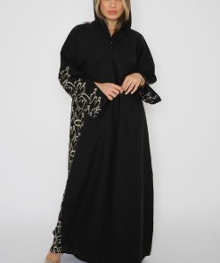 أمول – عباية سوداء بقماش مقلم في الكم والاطراف R1097