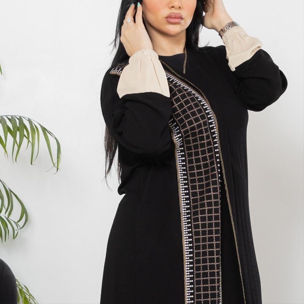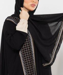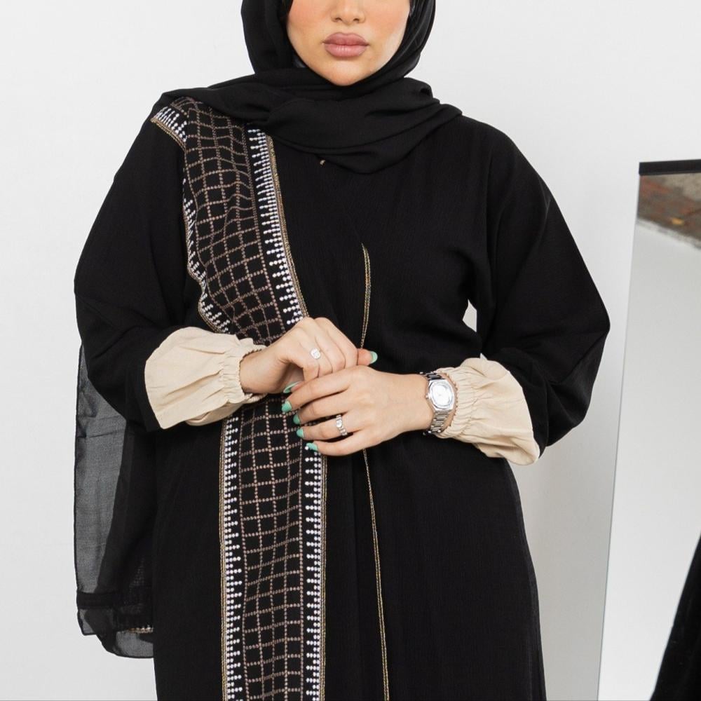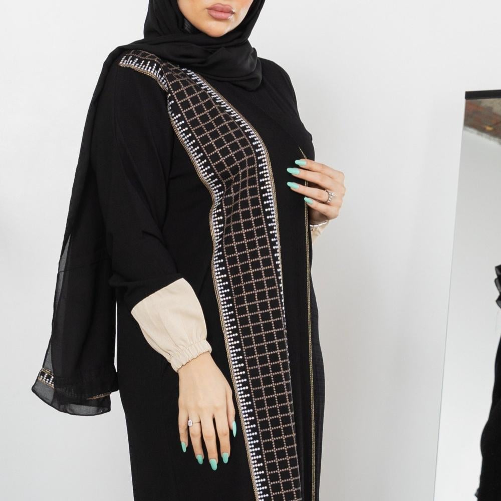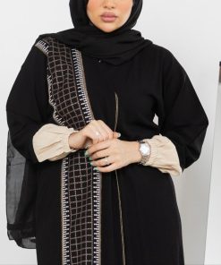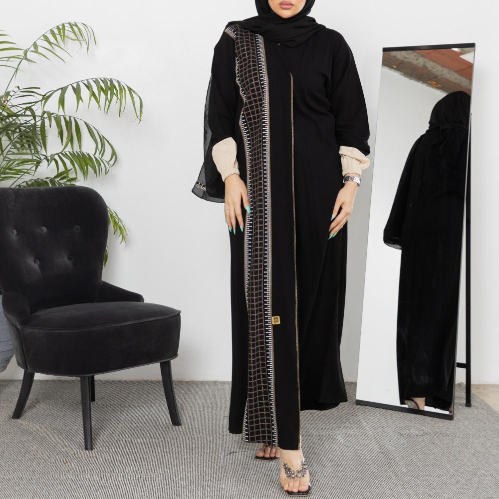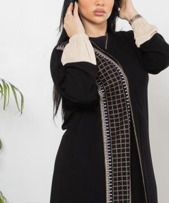 أمول – عباية سوداء بقماش مقلم في الكم والاطراف R1097