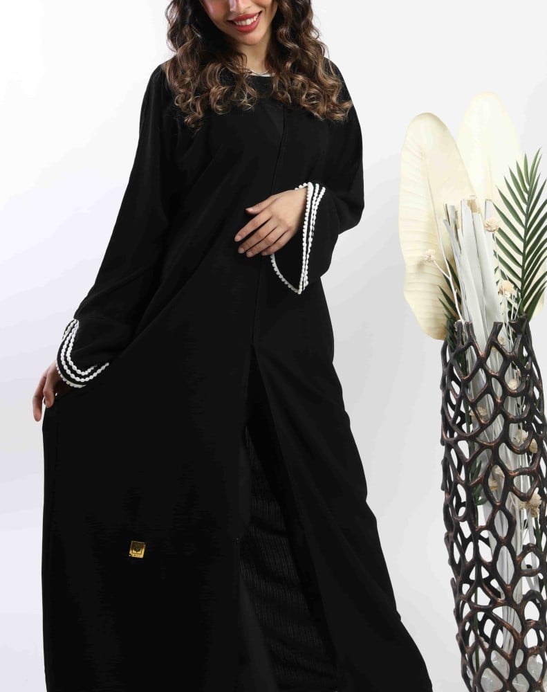 أمول – عباية سوداء بتداخل قماش وفصوص فضية طولية وعلى الكم 5083