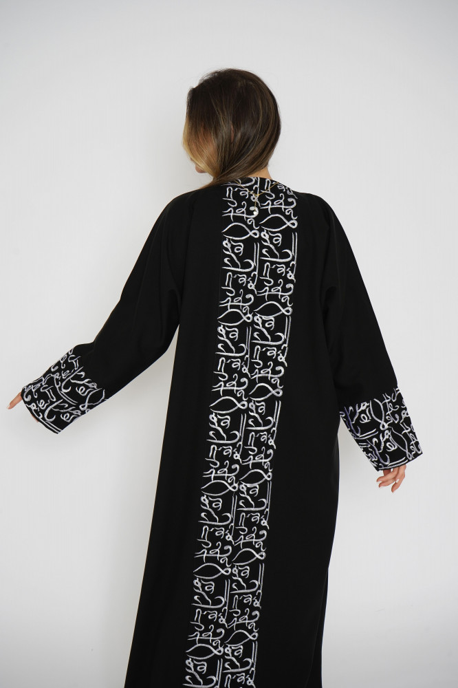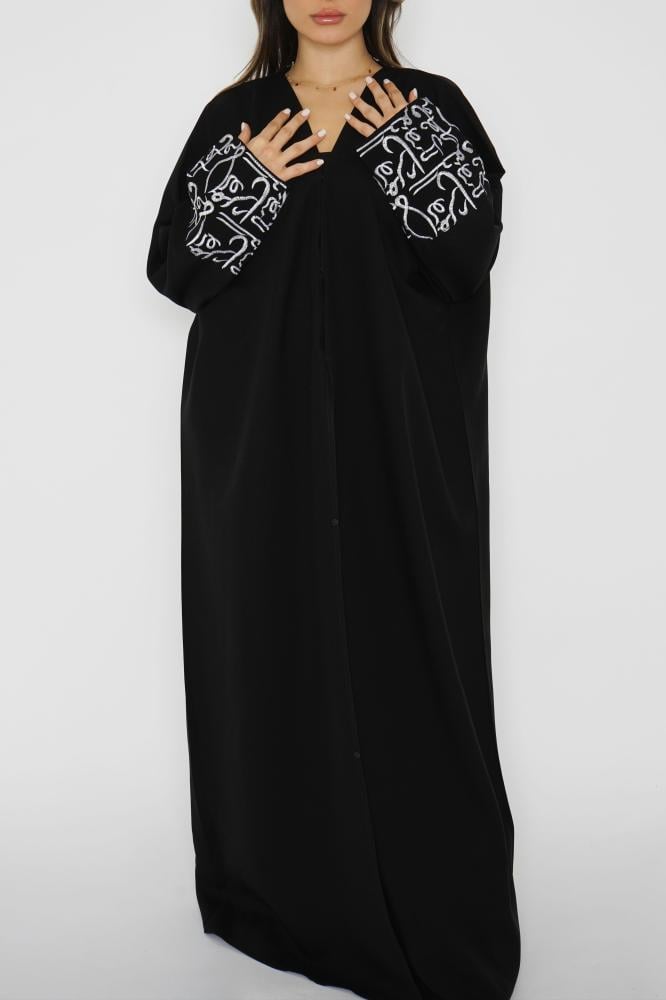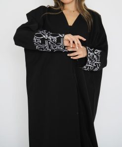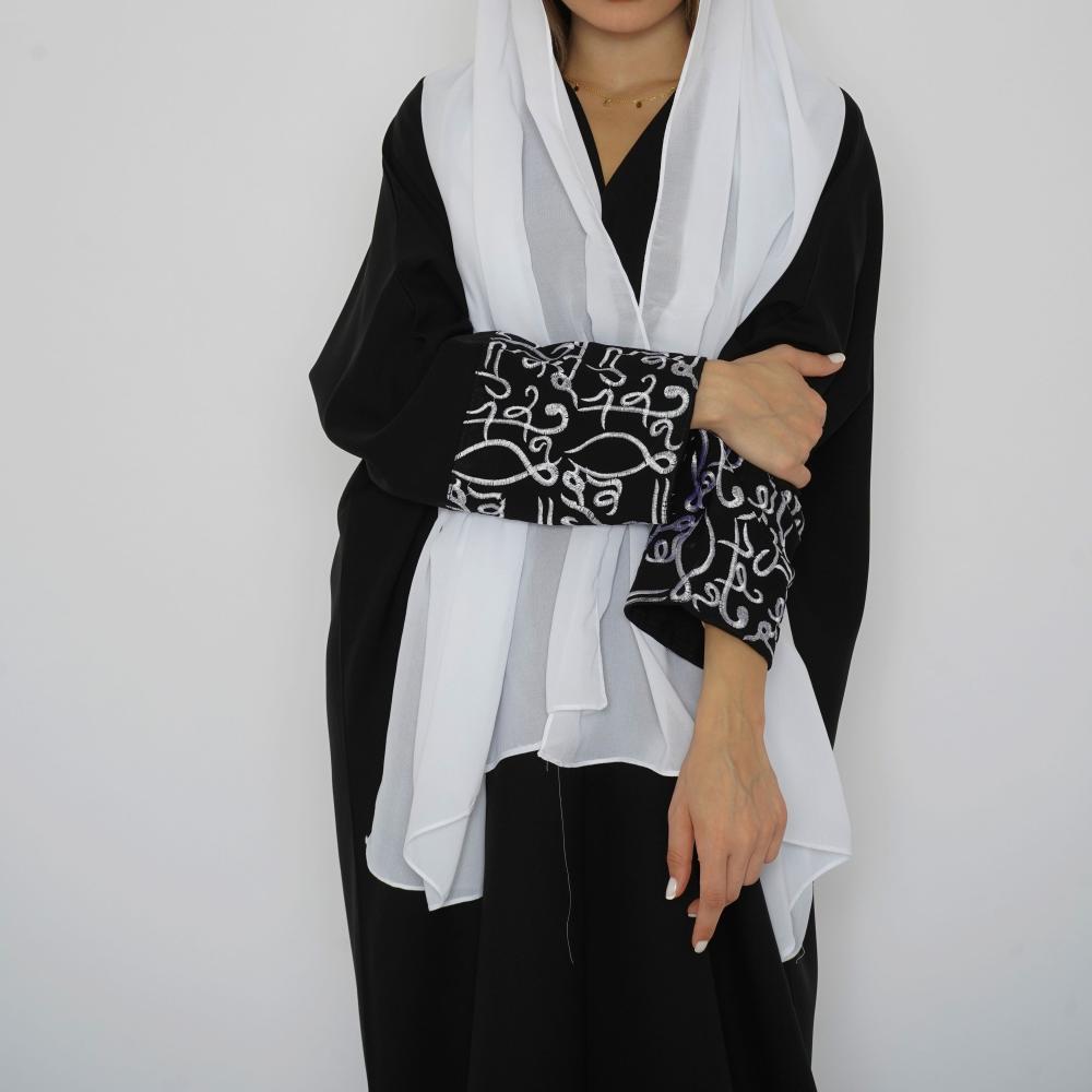 أمول – عباية سودا ء تطريز شك يدوي لون ابيض على شكل ورود 6051