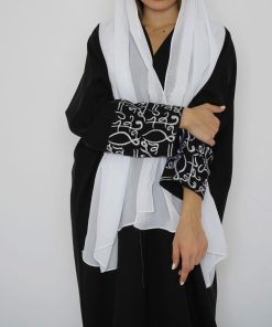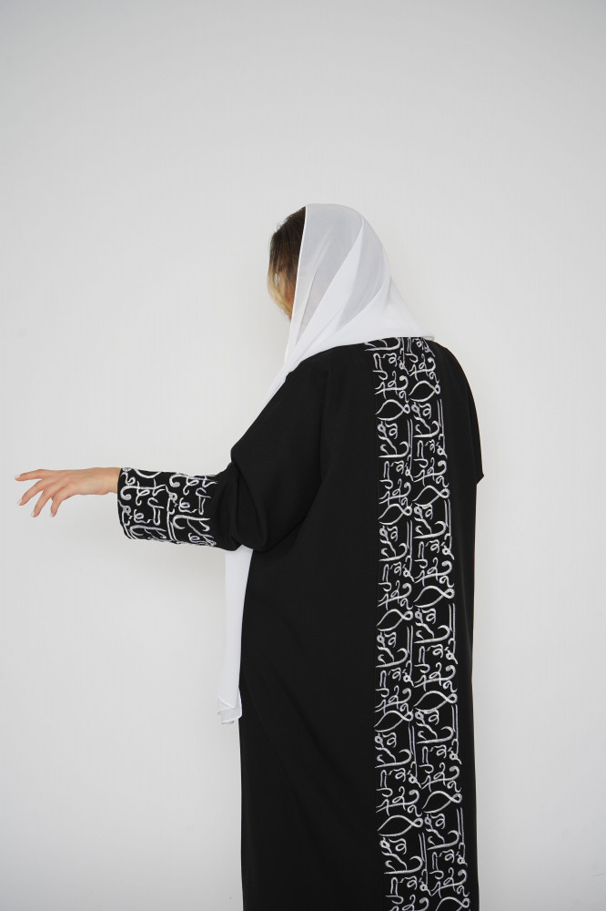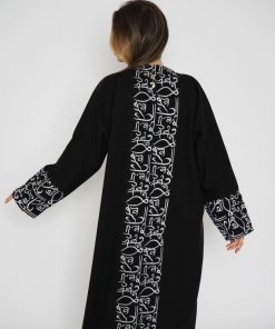 أمول – عباية سودا ء مطرز بخيوط طوليه باشكال متداخله لون ابيض و جالكسي 6058