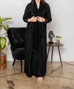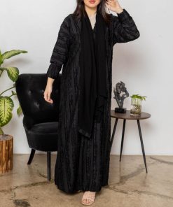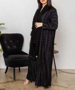 أمول – عباية سوداء بتداخل قماش وفصوص فضية طولية وعلى الكم 5083