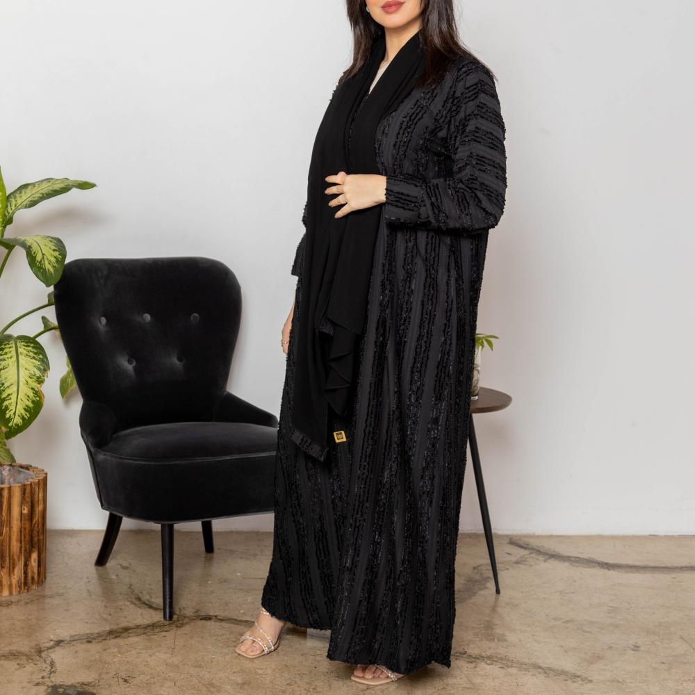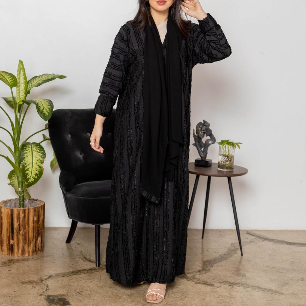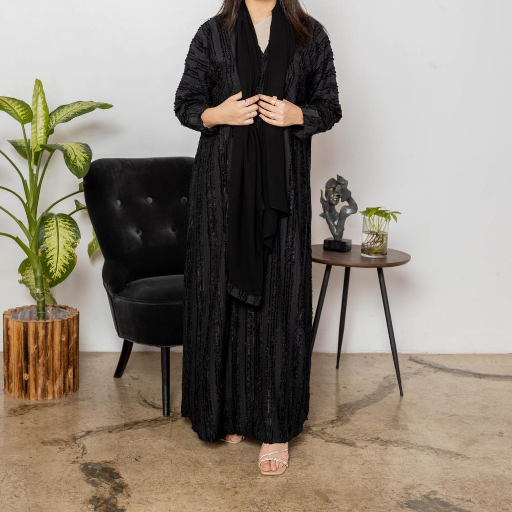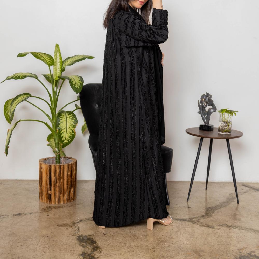 أمول – عباية سوداء بتداخل من قماش مخطط اللون الأبيض 5089
