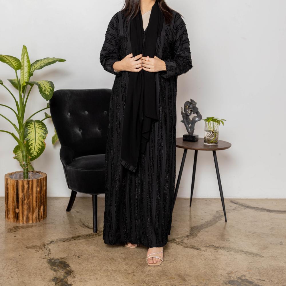 أمول – عباية سودا ء مطرز بخيوط طوليه باشكال متداخله لون ابيض و جالكسي 6058