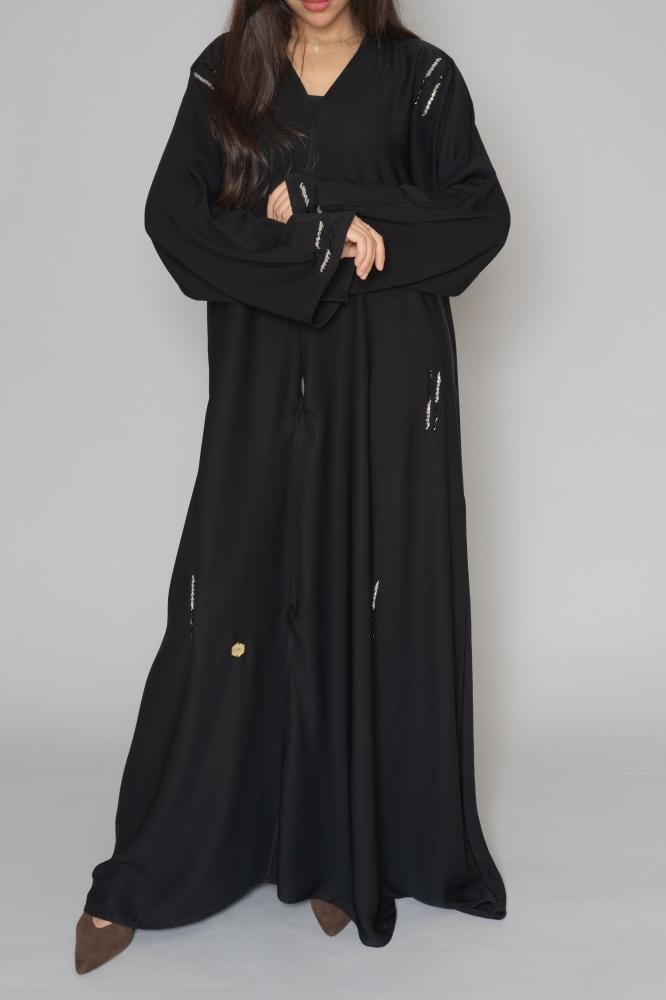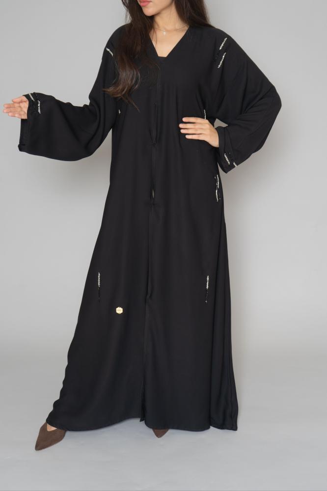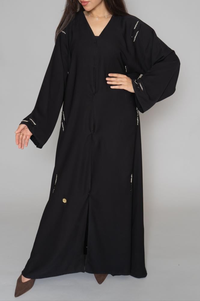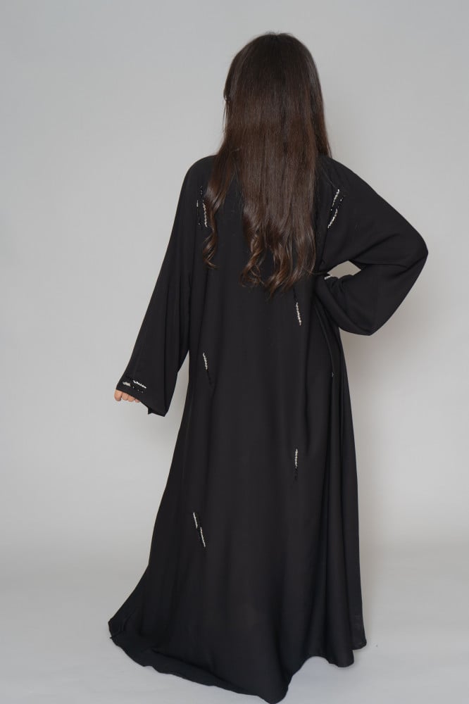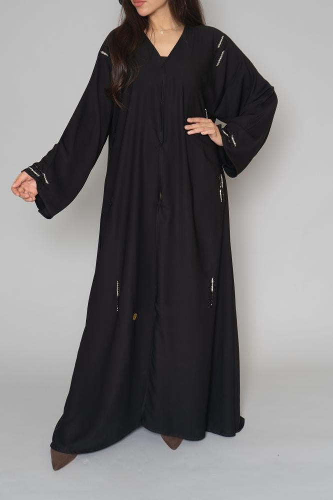 أمول – عباية سوداء بكسرات بمسارات طولية مطرزة بقطع كريستال متفرقة 6010