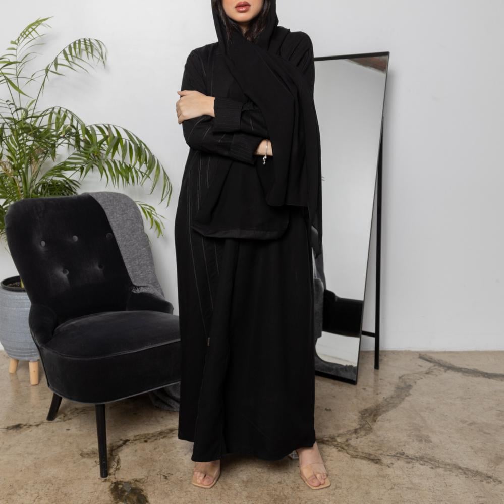 أمول – عباية سوداء بتطريز بأطراف العباية مع كسرات فاخرة من الخلف 6028