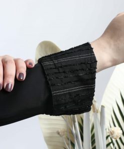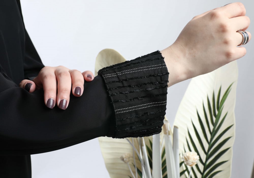 أمول – عباية سوداء بتداخل من قماش مخطط اللون الأبيض 5089