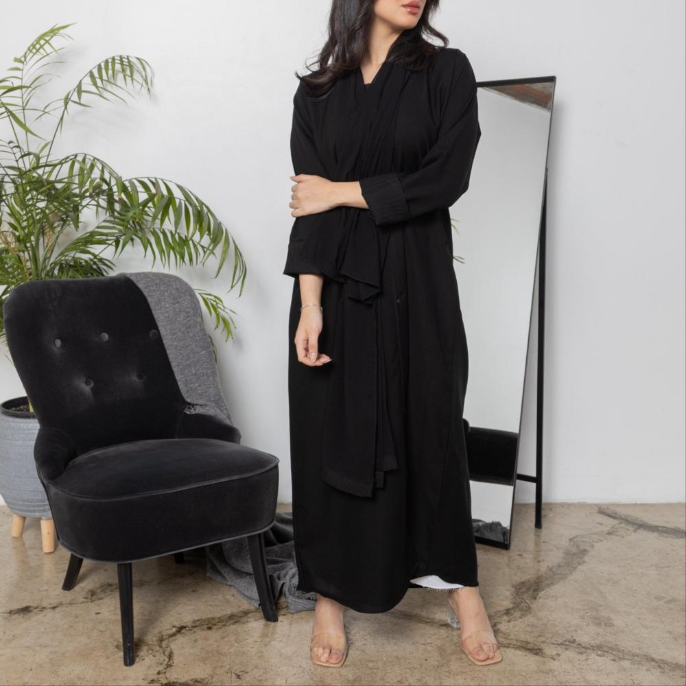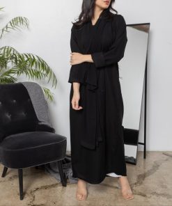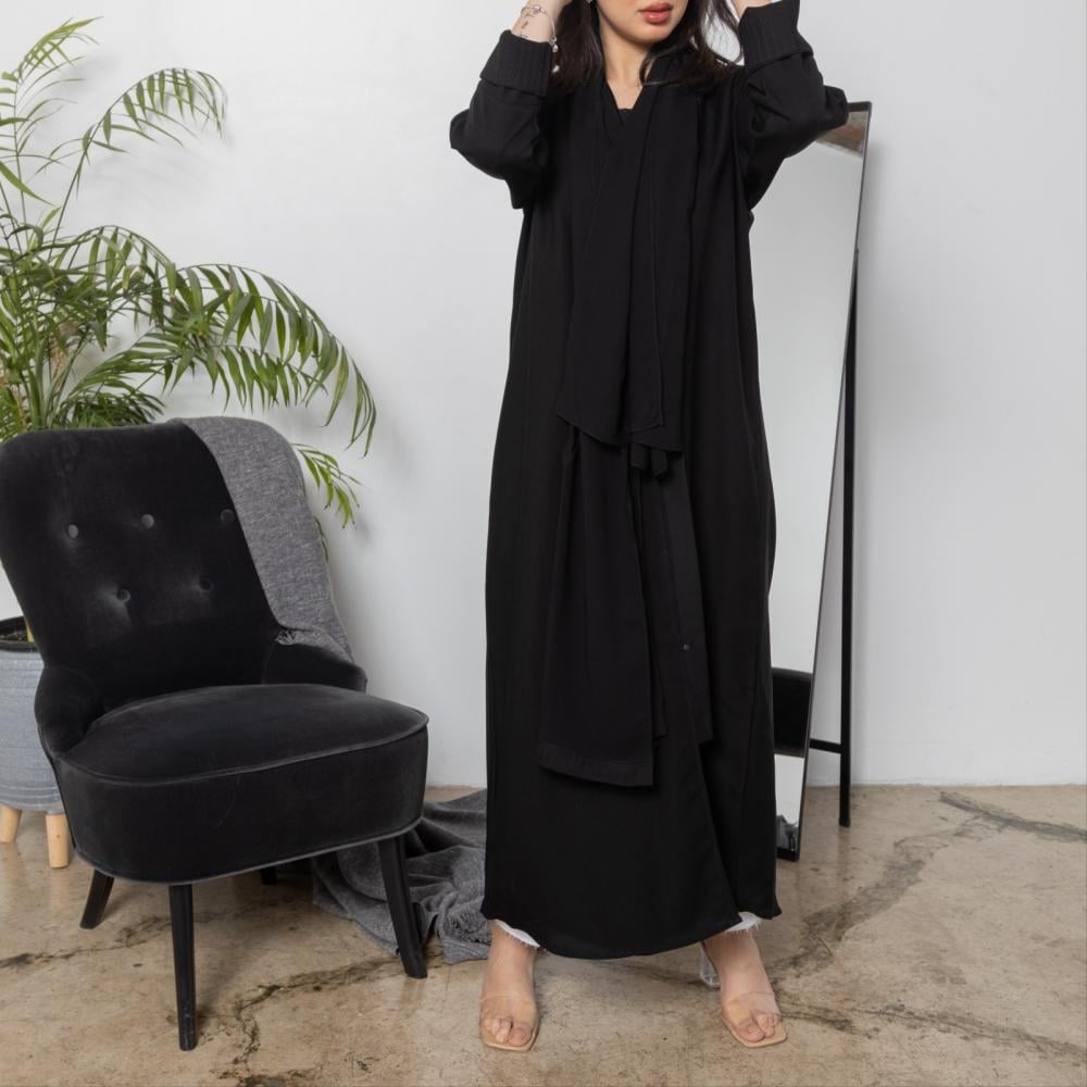 أمول – عباية سودا ء تطريز شك يدوي لون ابيض على شكل ورود 6051