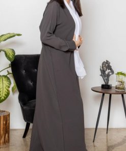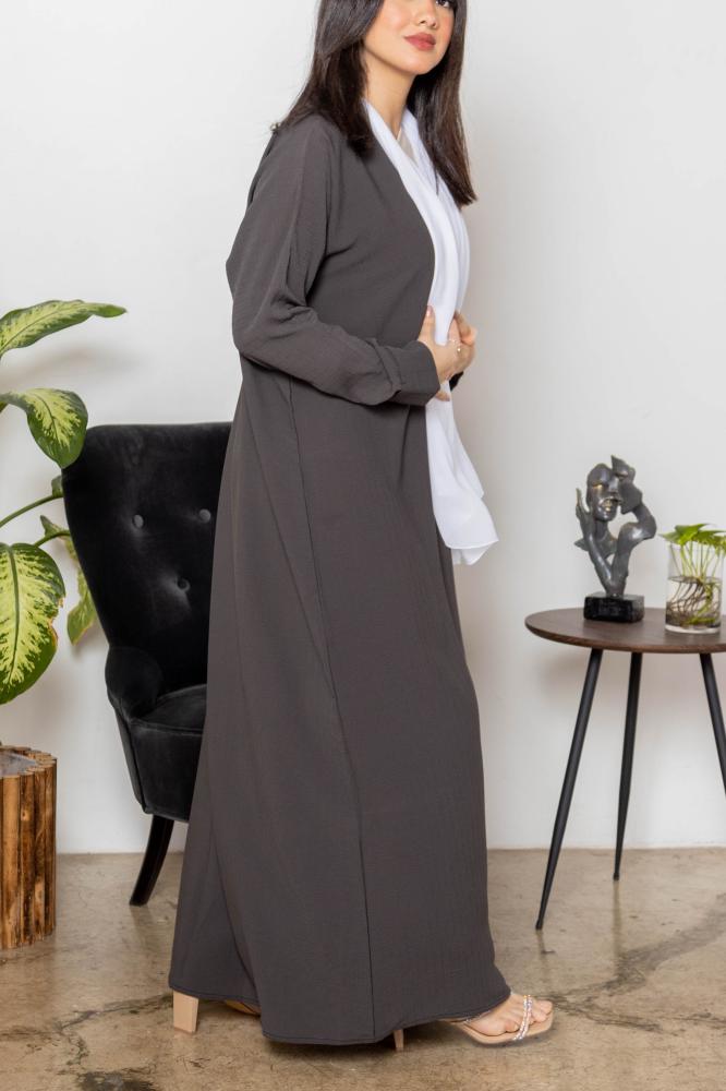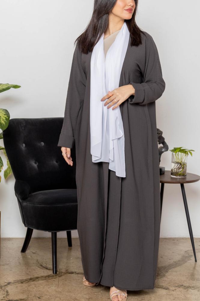 أمول – عباية سوداء بتداخل من قماش مخطط اللون الأبيض 5089