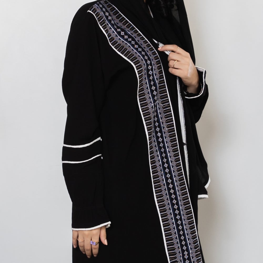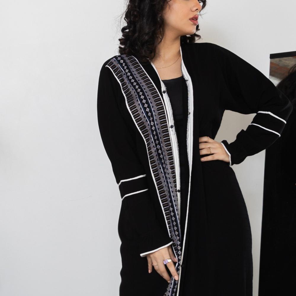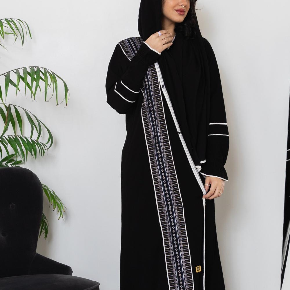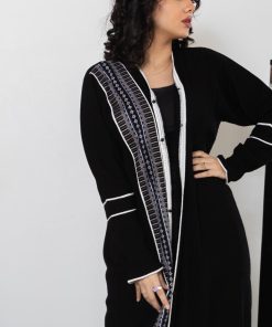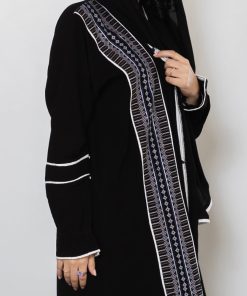 أمول – عباية سودا ء مطرز بخيوط طوليه باشكال متداخله لون ابيض و جالكسي 6058
