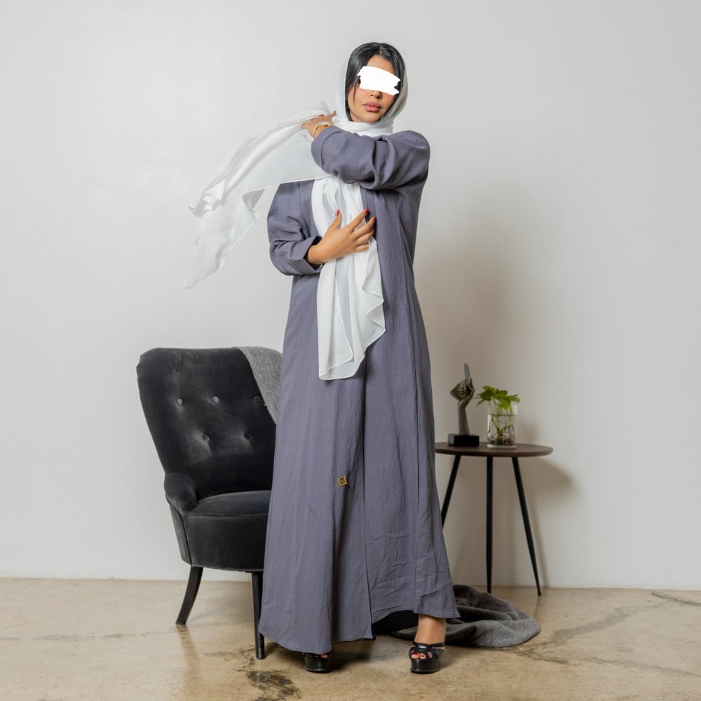 أمول – عباية سوداء بتداخل قماش وفصوص فضية طولية وعلى الكم 5083