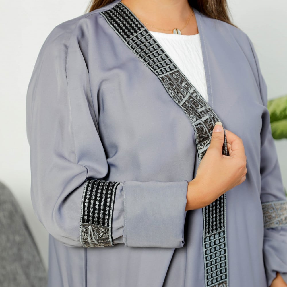 أمول – عباية سوداء بتداخل من قماش مخطط اللون الأبيض 5089