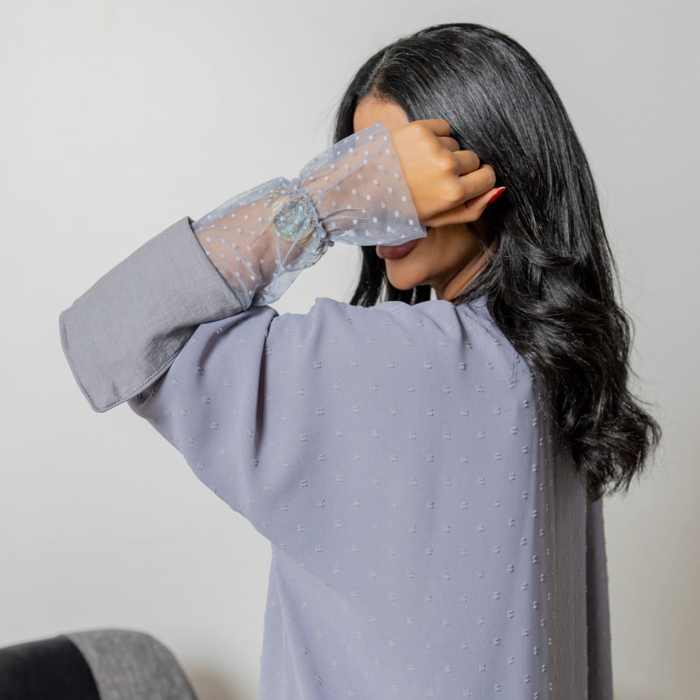 أمول – عباية سوداء بتداخل قماش وفصوص فضية طولية وعلى الكم 5083