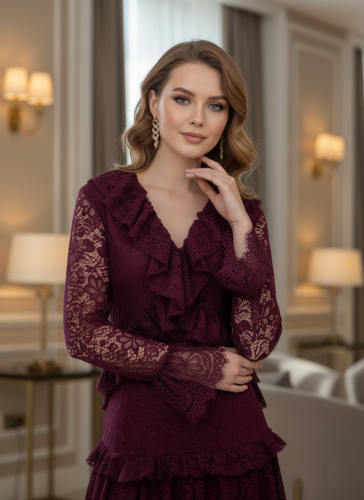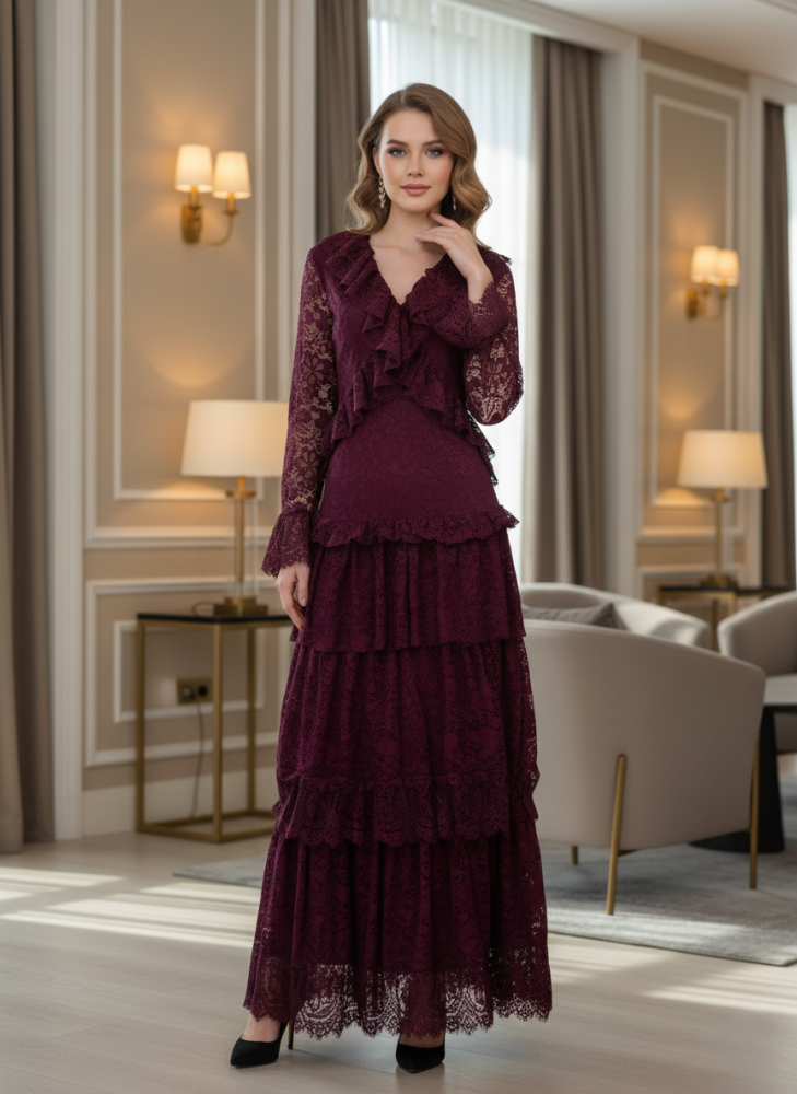 أوبرا فاشن – فستان دانتيل برغندي بطبقات وكشكشة أنيقة بتصميم راقٍ