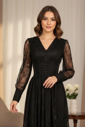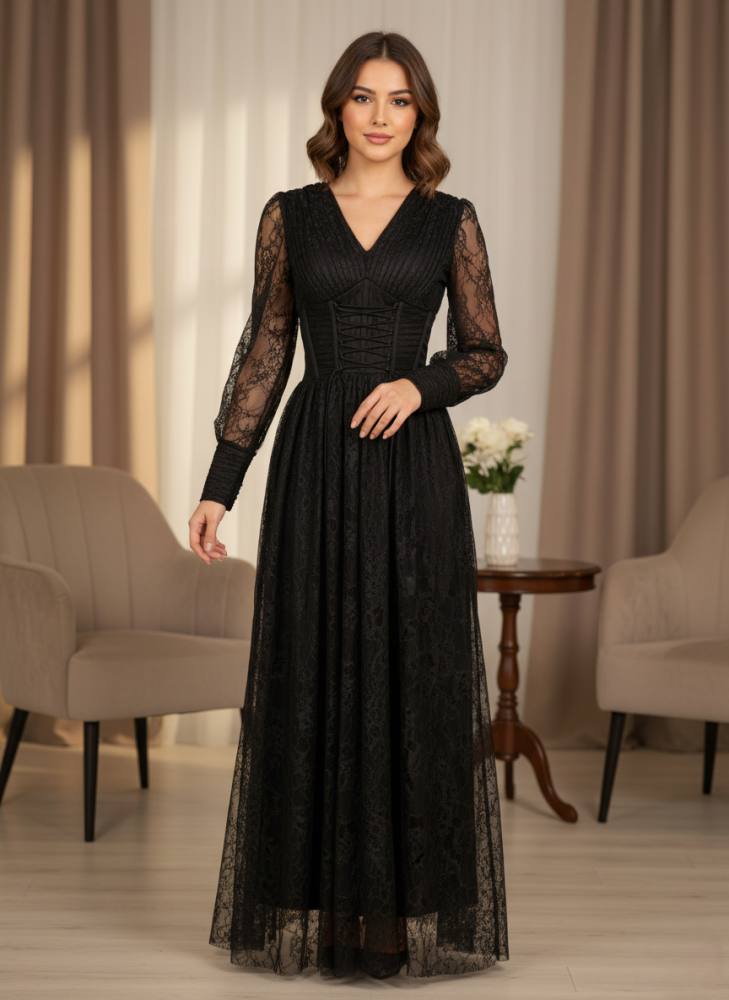 أوبرا فاشن – فستان سهرة أسود دانتيل بأكمام طويلة وتصميم كورسيه راقٍ