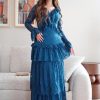 أوبرا فاشن – فستان سهرة أسود مخمل بتطريز لؤلؤ فاخر وشال شيفون أنيق