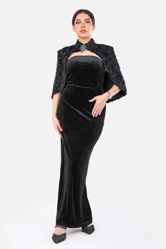 أوبرا فاشن – فستان سهرة اسود توب قماش مخمل مع شال مورد