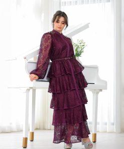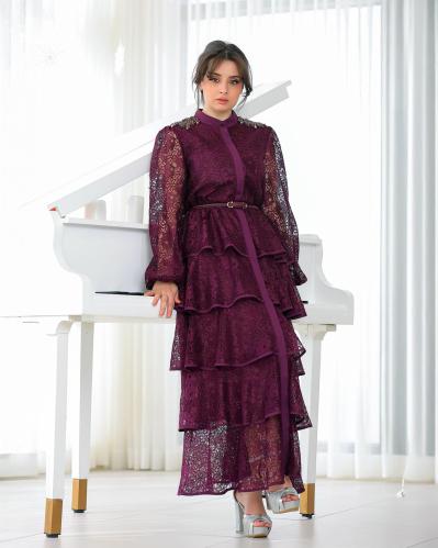 أوبرا فاشن – فستان سهرة برغندي دانتيل بطبقات مزين بكرستال على الكتف