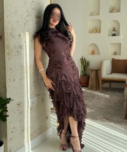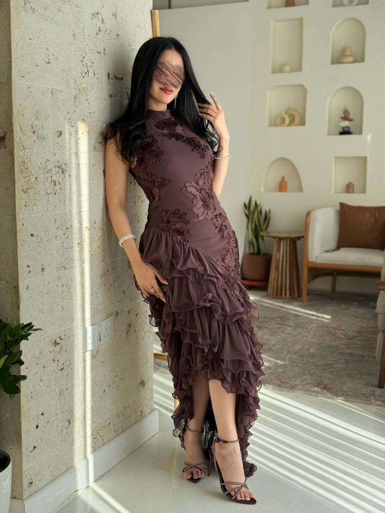 أوبرا فاشن – فستان سهرة بني أنيق بتطريز وكشكش ناعم