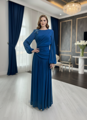 أوبرا فاشن – فستان سهرة تركواز جورسيه لامع بتصميم دربيات وإكسسوار كريستال