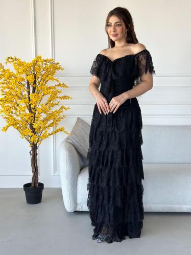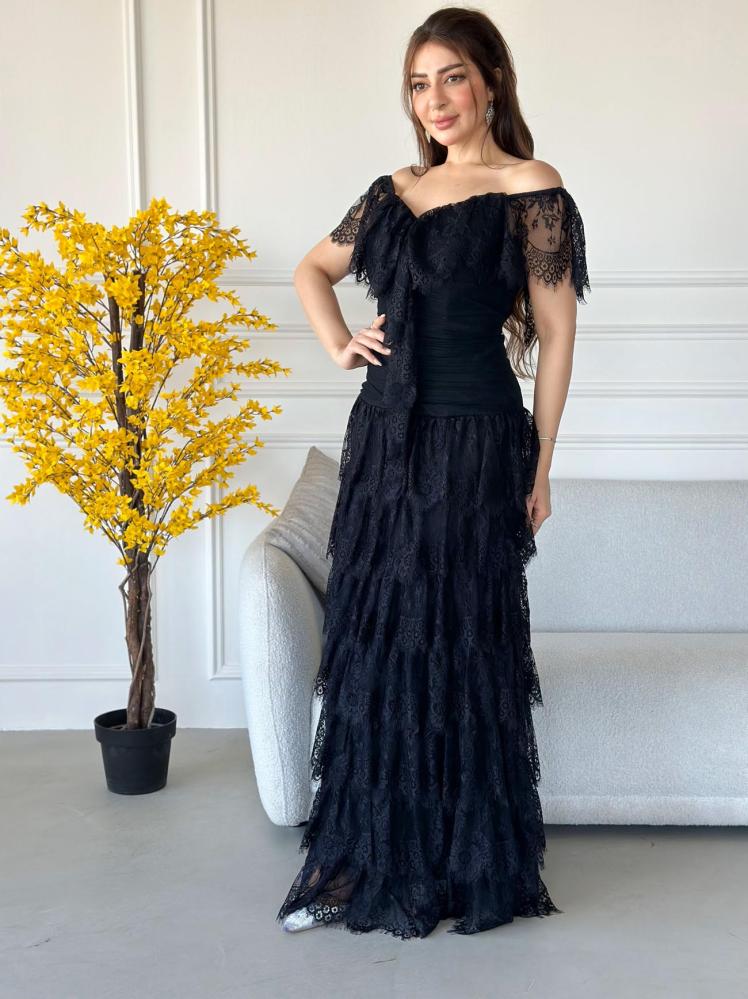 أوبرا فاشن – فستان طويل اسود قماش دانتيل ومزين بطبقات واكتاف مكشوفة