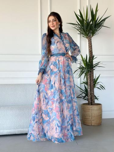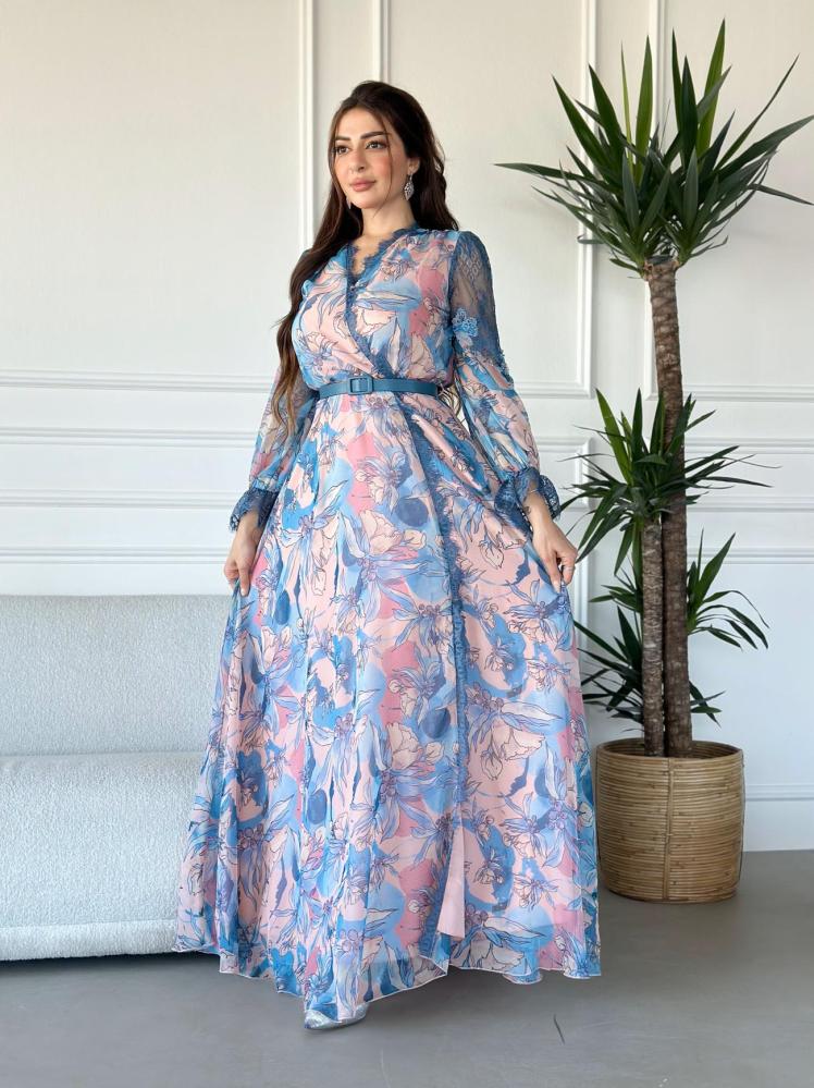 أوبرا فاشن – فستان طويل لف قماش شيفون مشجر اكمام طويله وبالكتف دانتيل
