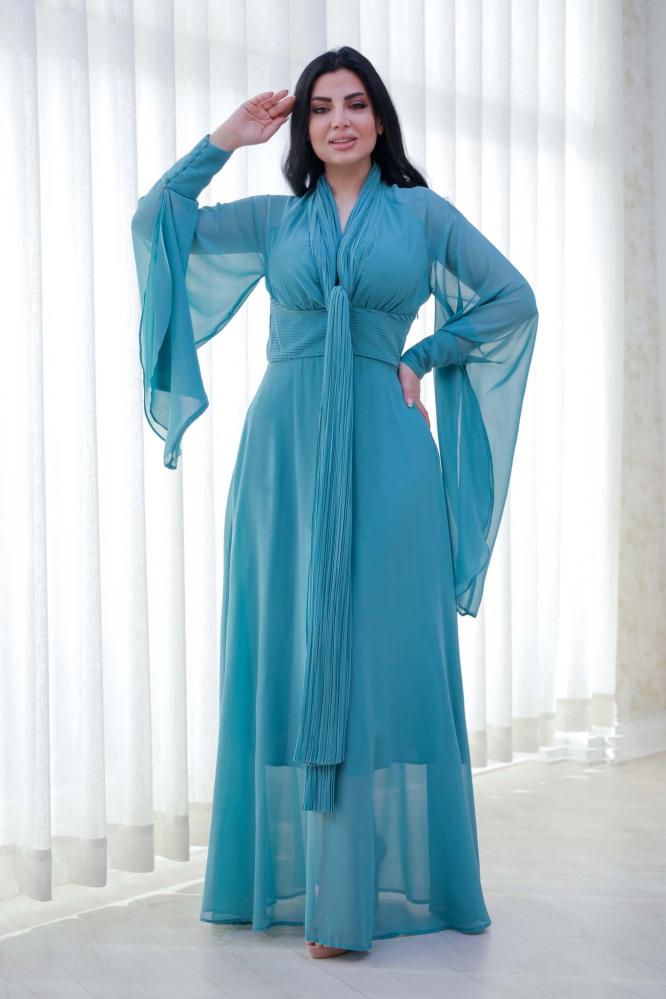 أوبرا فاشن – فستان طويل لون تيفاني قماش كريب شيفون بأكمام طويله وكسرات اسفل الصدر