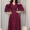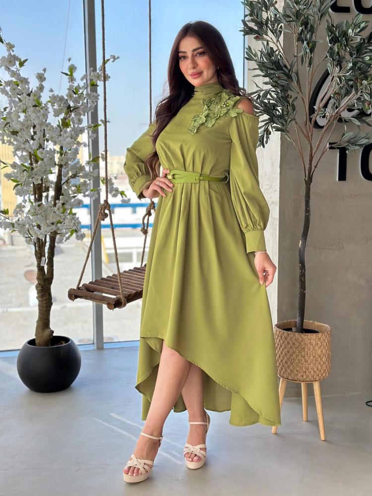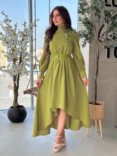 أوبرا فاشن – فستان ليموني مزين بالكتف بورود ثلاثية الابعاد اكمام طويلة