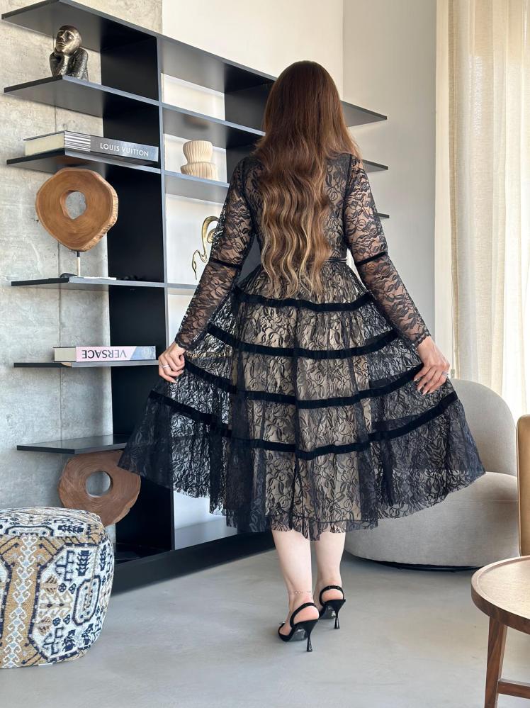 أوبرا فاشن – فستان ميدي اسود دانتيل وبطانه استرتش اكمام طويله وشفافة