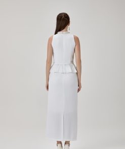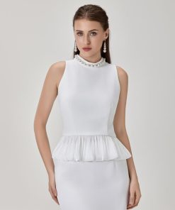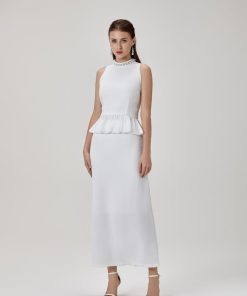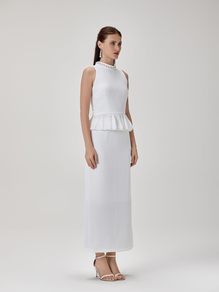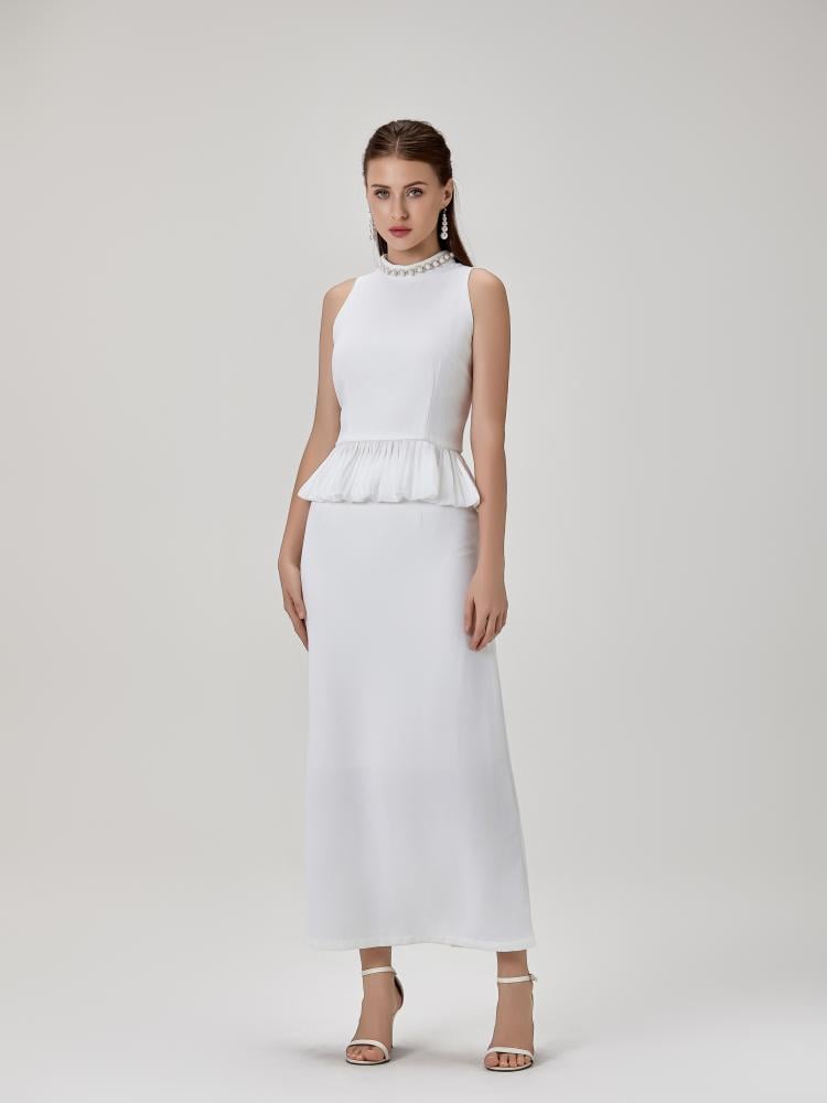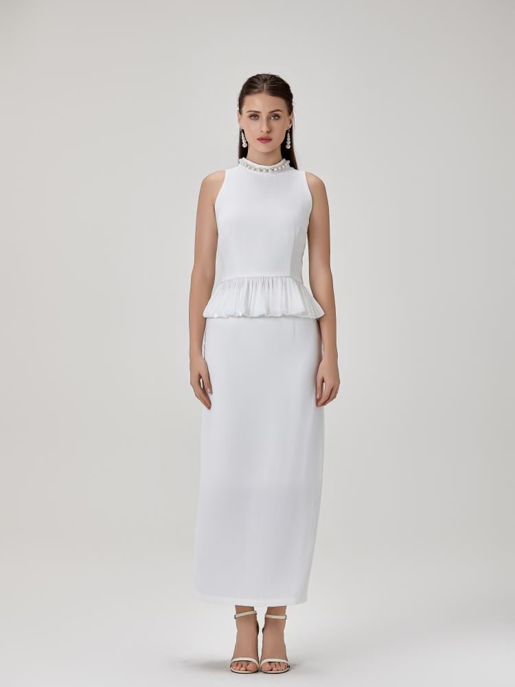 طقم بلوزة و تنورة بخامة الستان الناعمة و مزين بالإكسسوارت الراقية