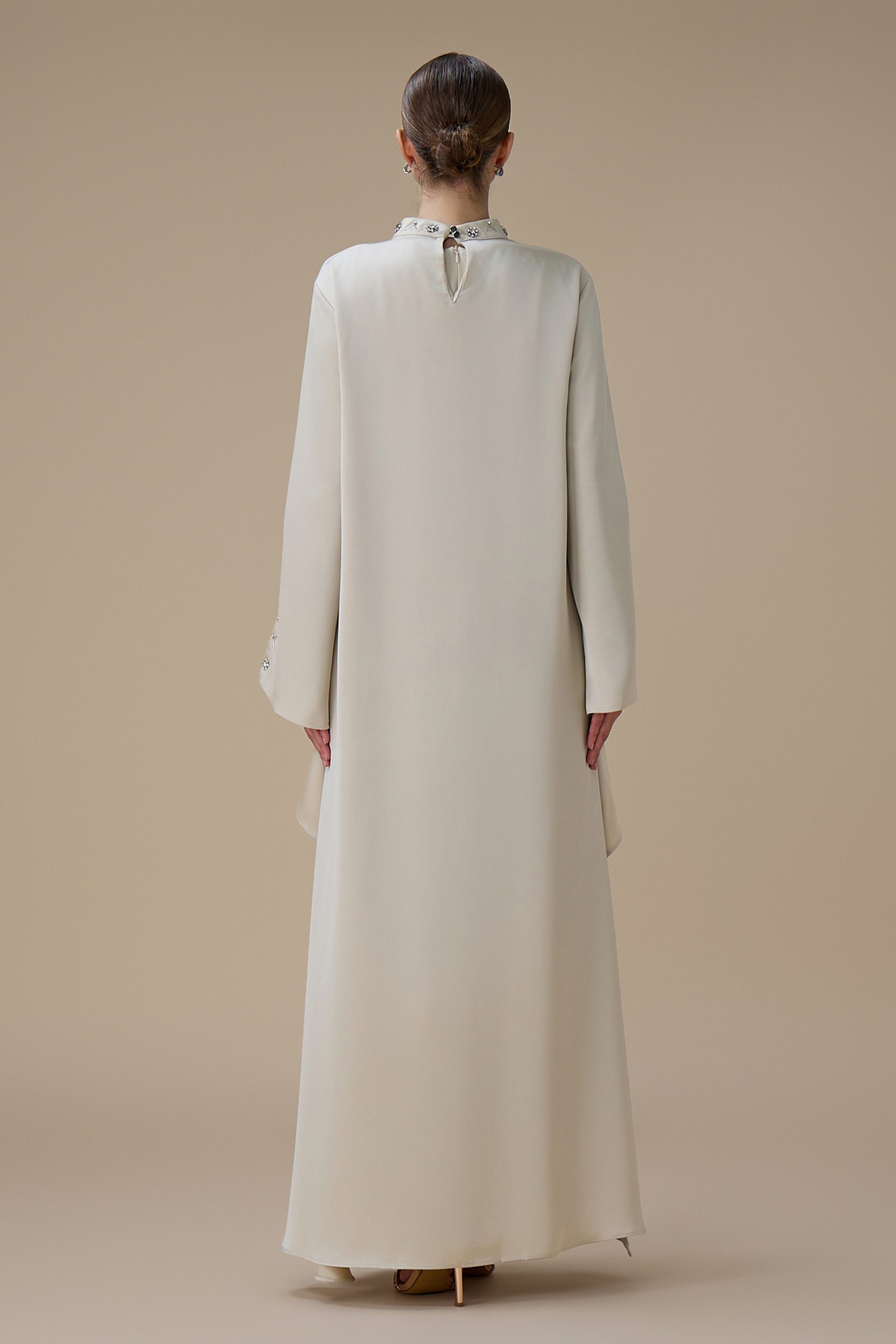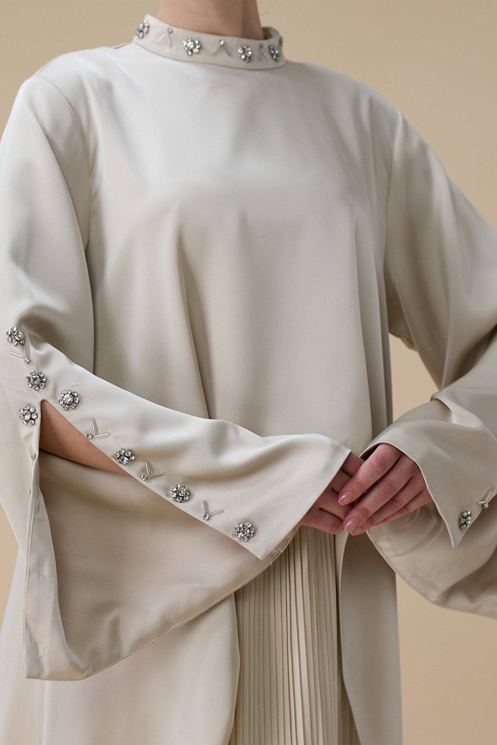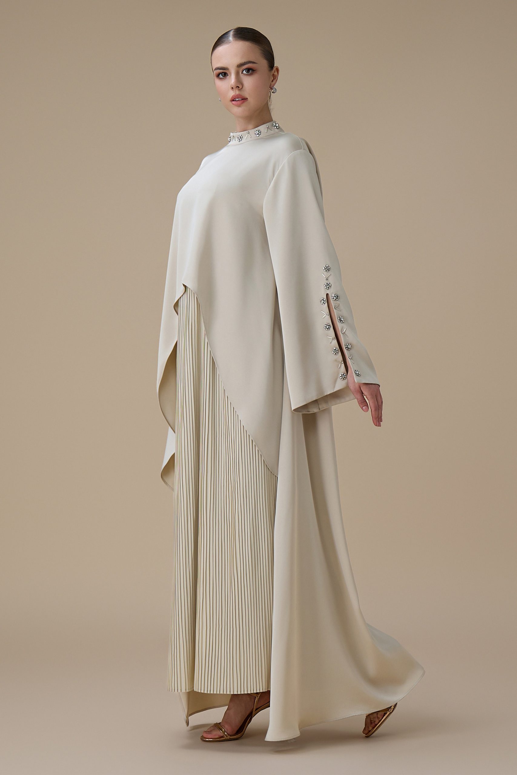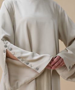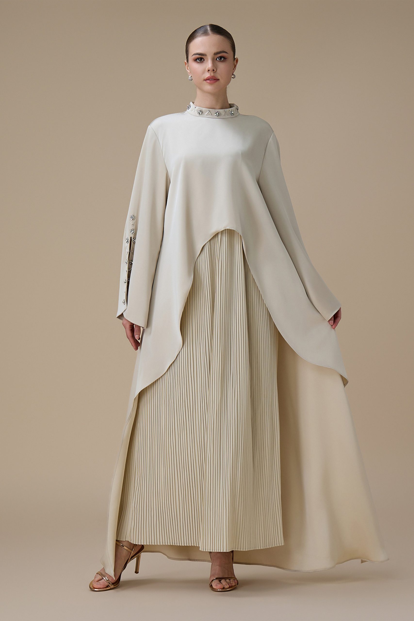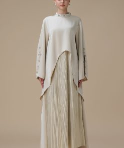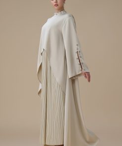 نوع القصة: جلابية أنيقة بيج بتصميم بليسيه بقصة مستقيمة مع طبقة علوية غير متماثلة بياقة مرتفعة –