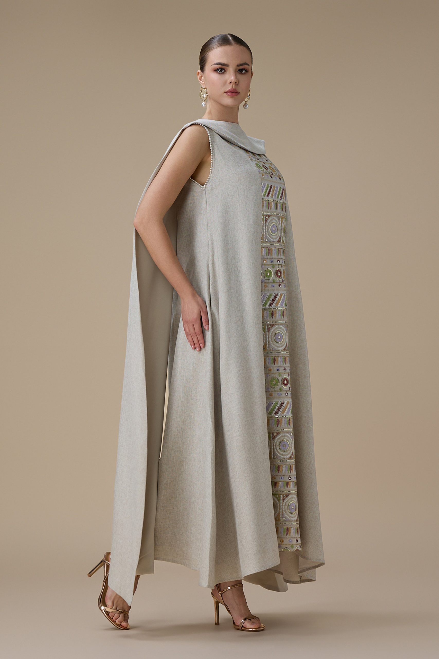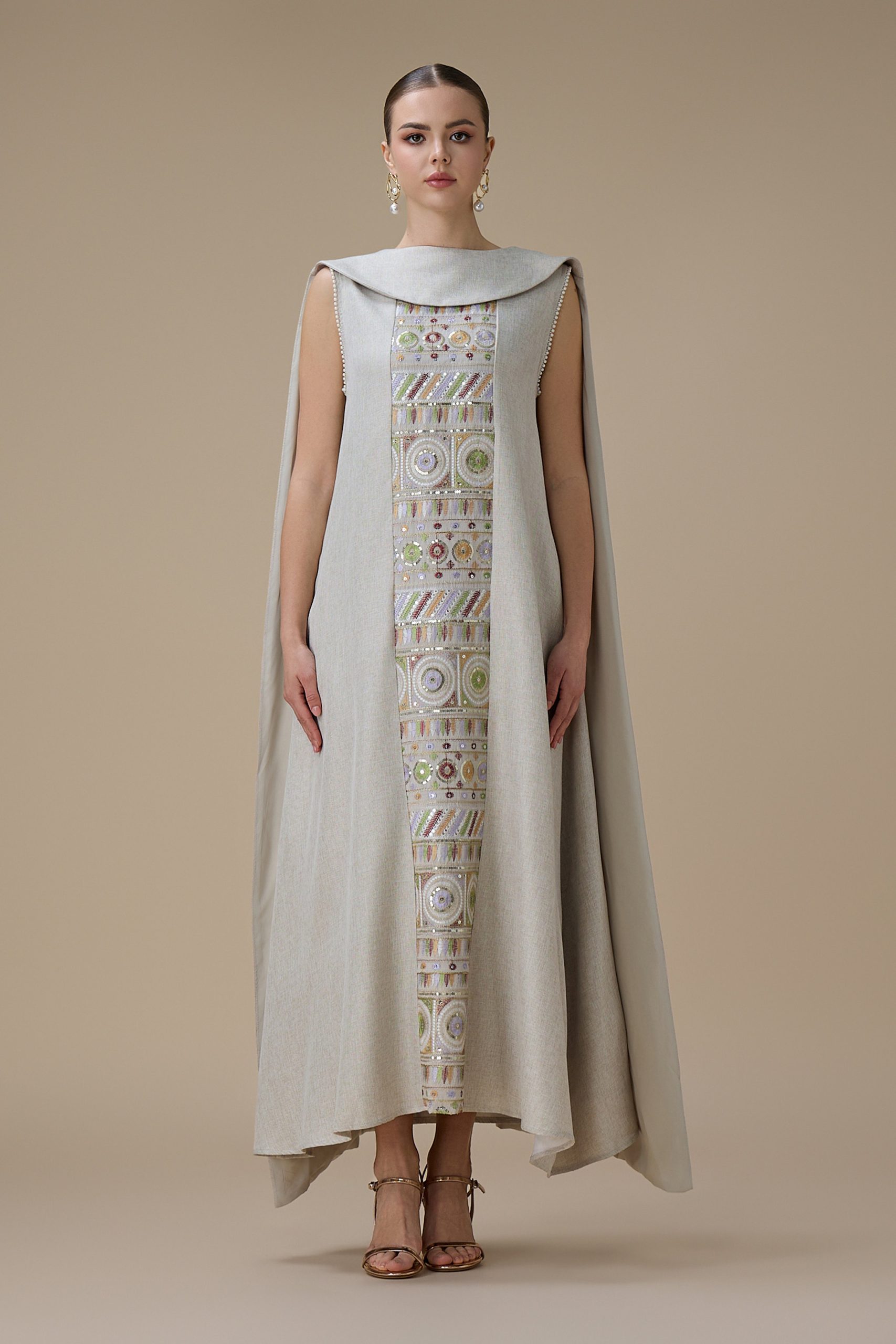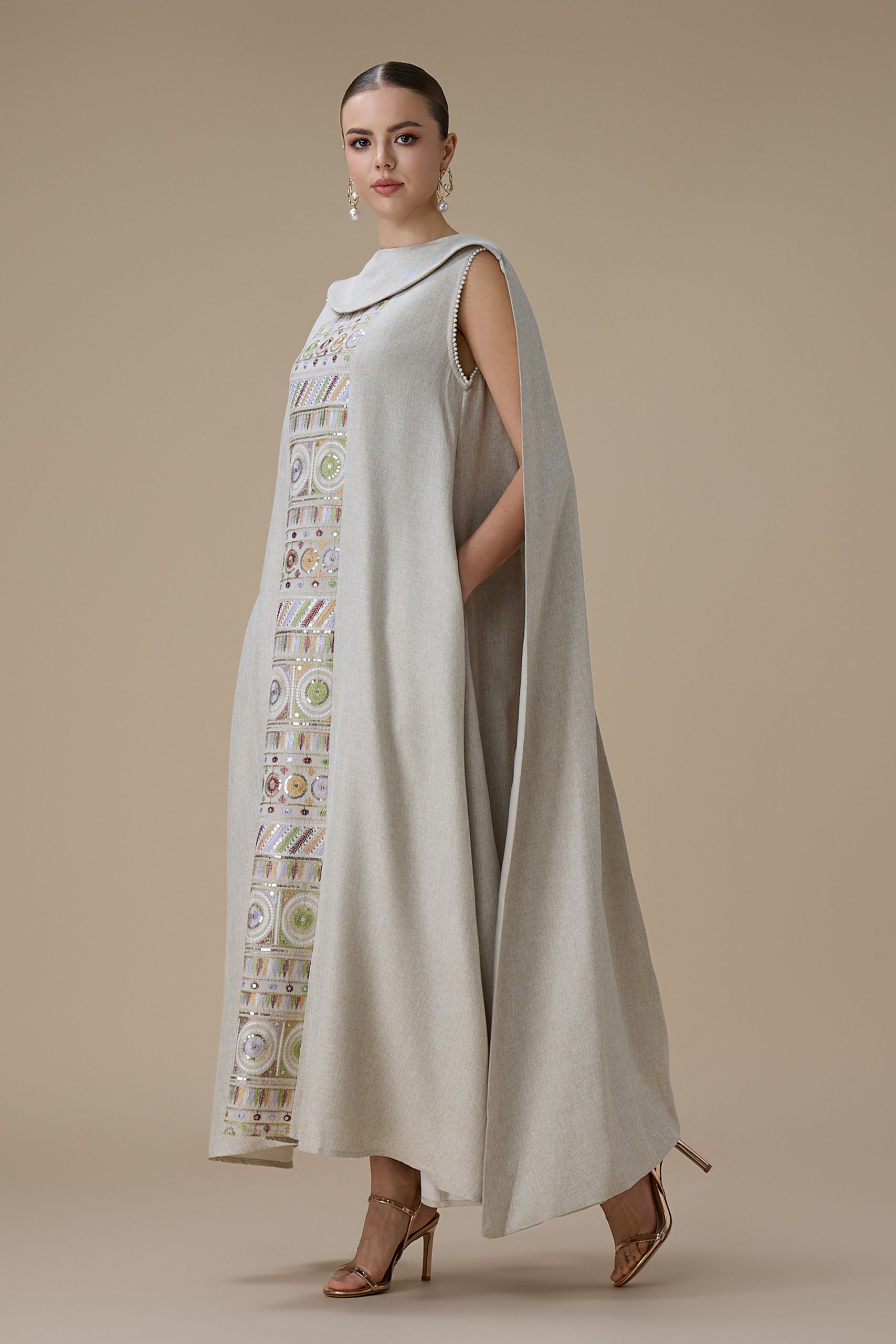 نوع القصة: جلابية بيج طويلة بتطريز مركزي وتصميم كاب بدون أكمام وبجيوب مخفية –
