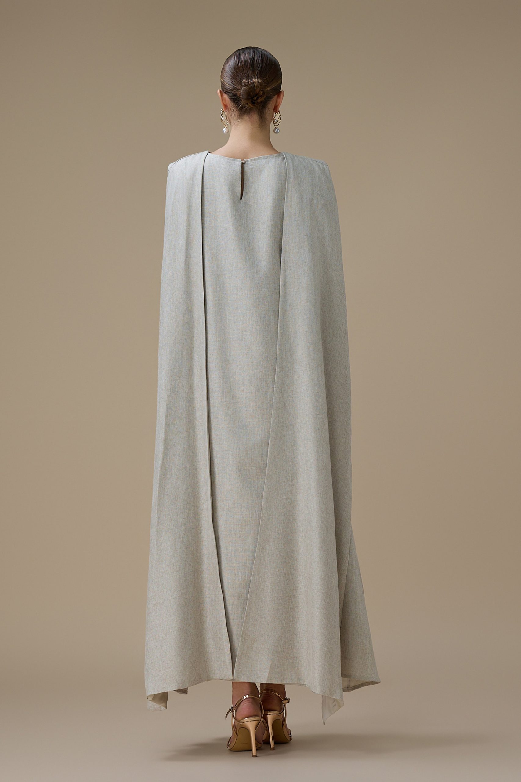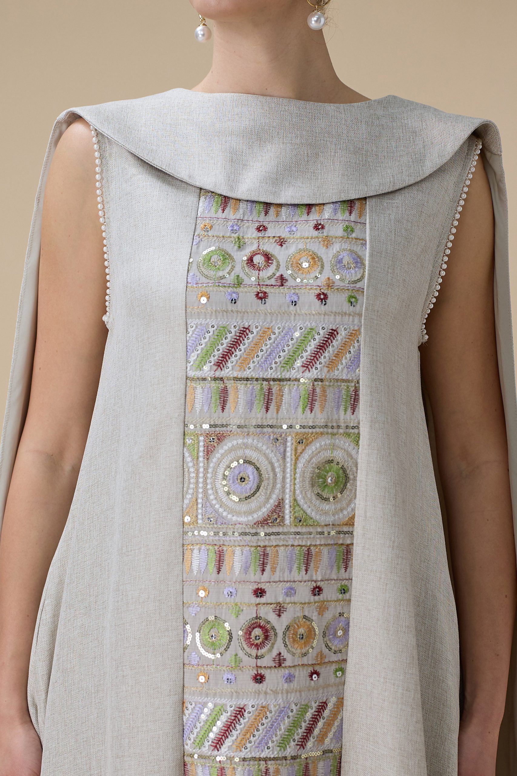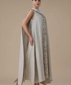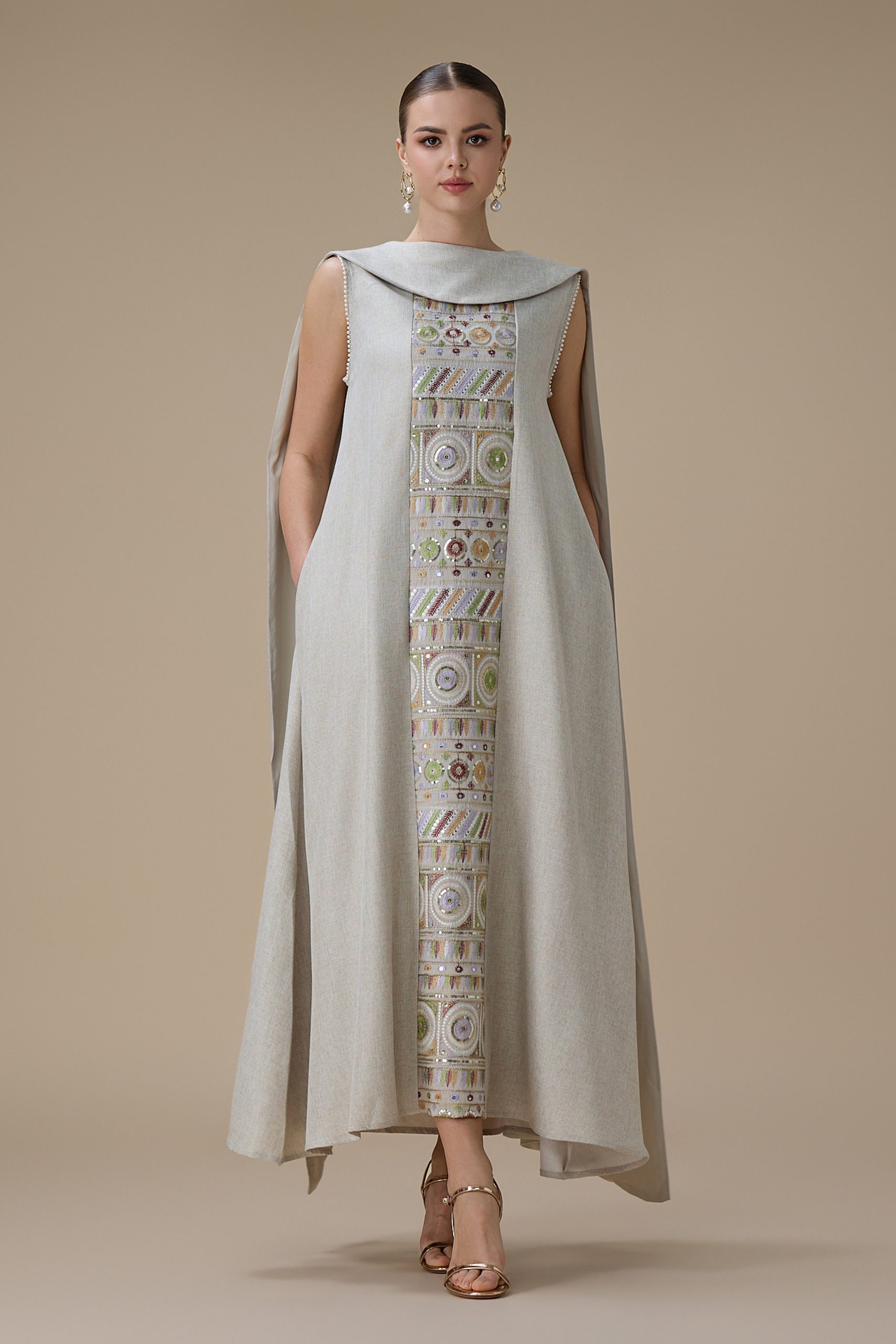 نوع القصة: جلابية بيج طويلة بتطريز مركزي وتصميم كاب بدون أكمام وبجيوب مخفية –