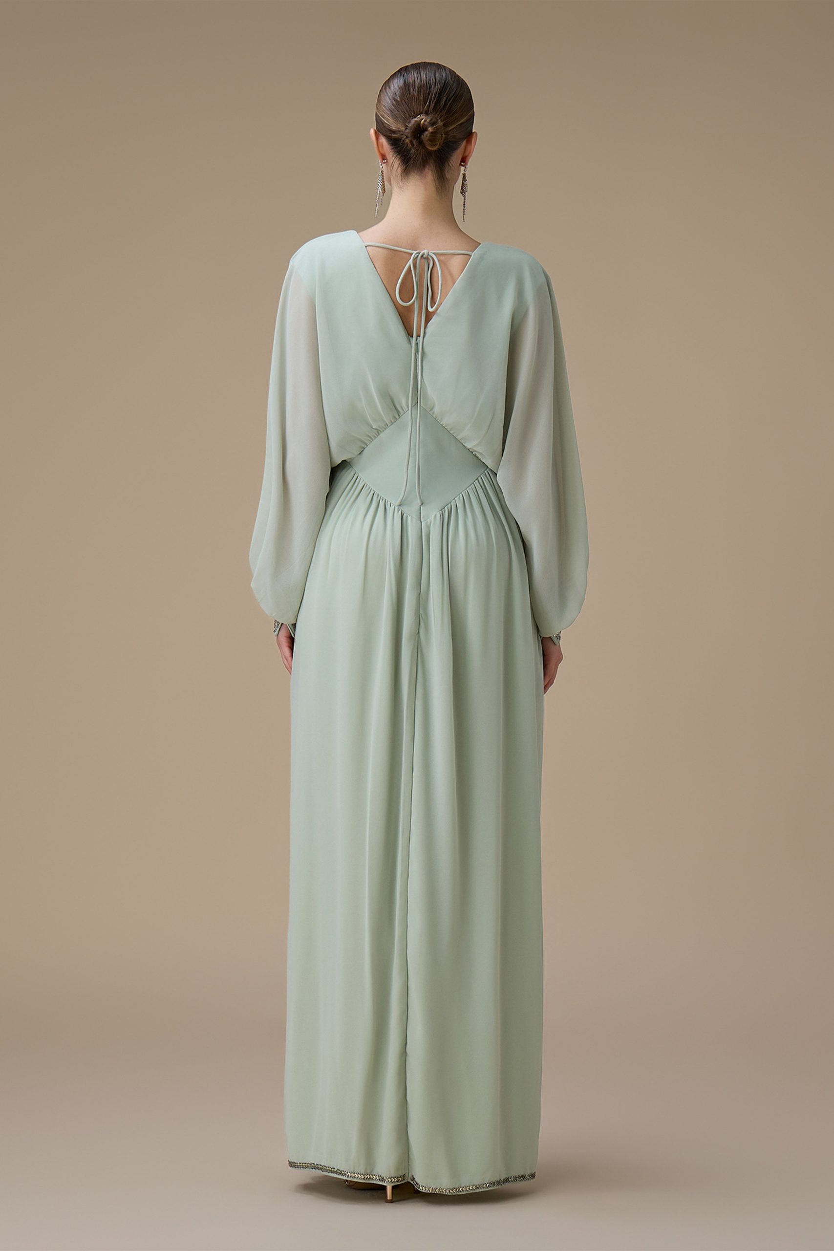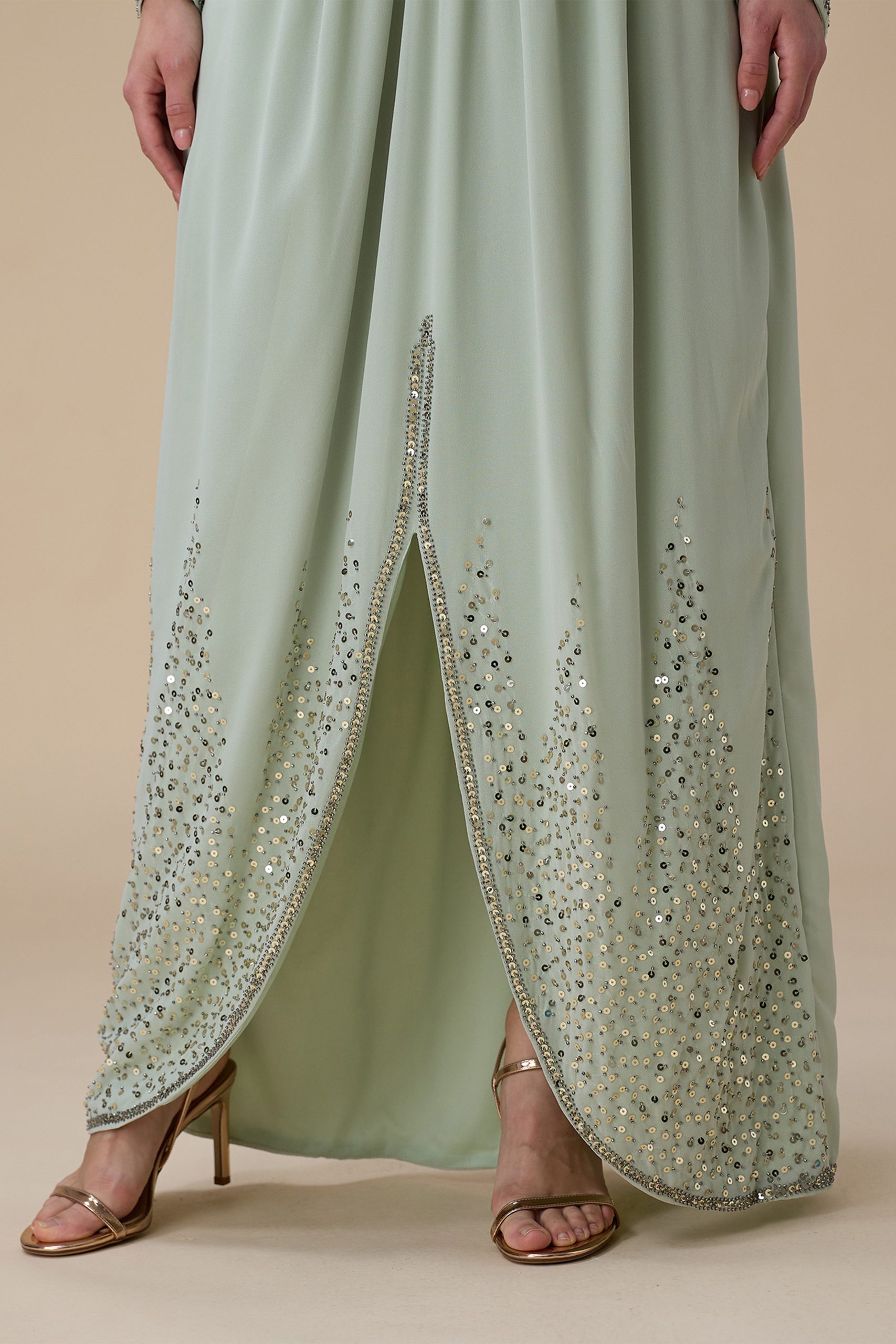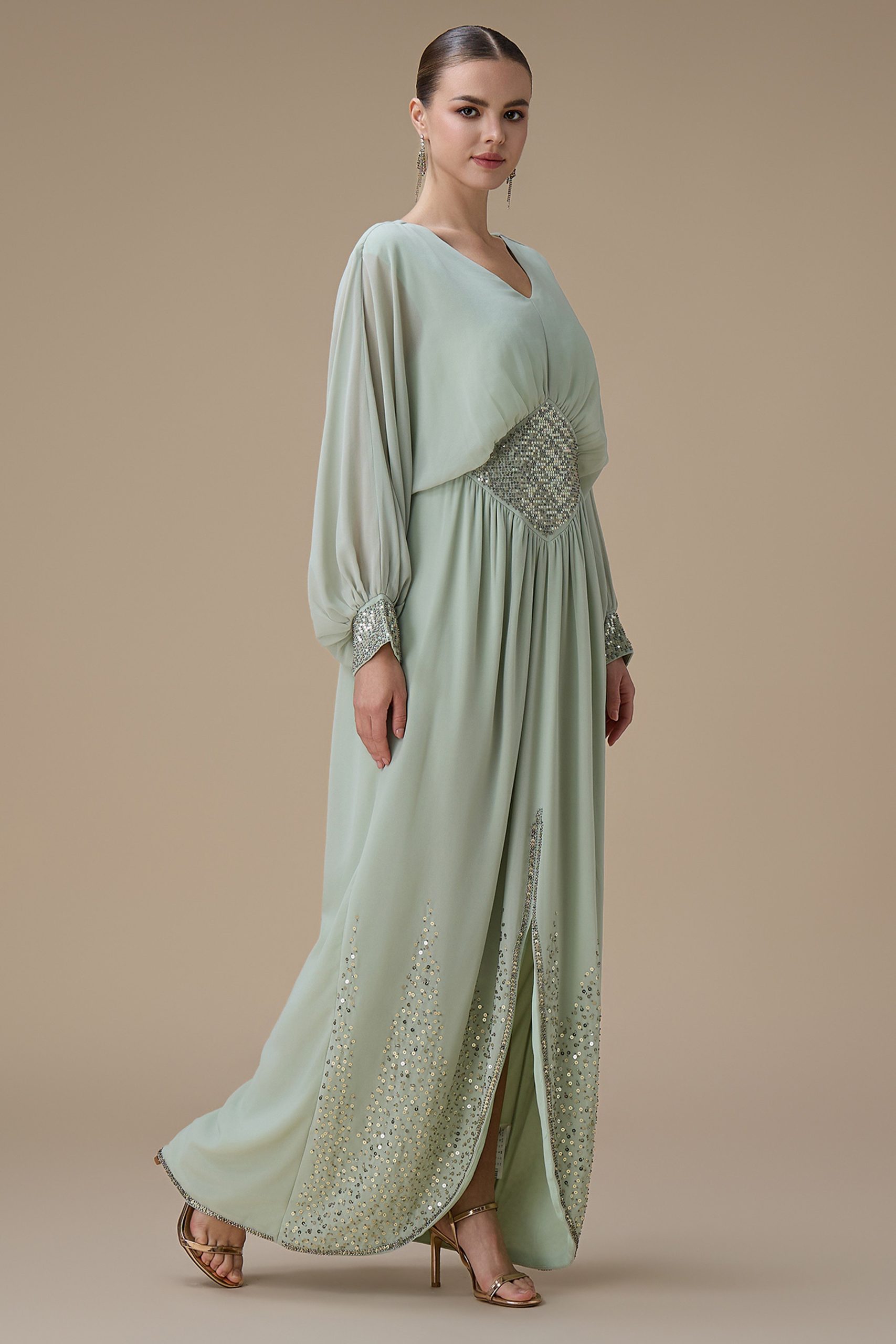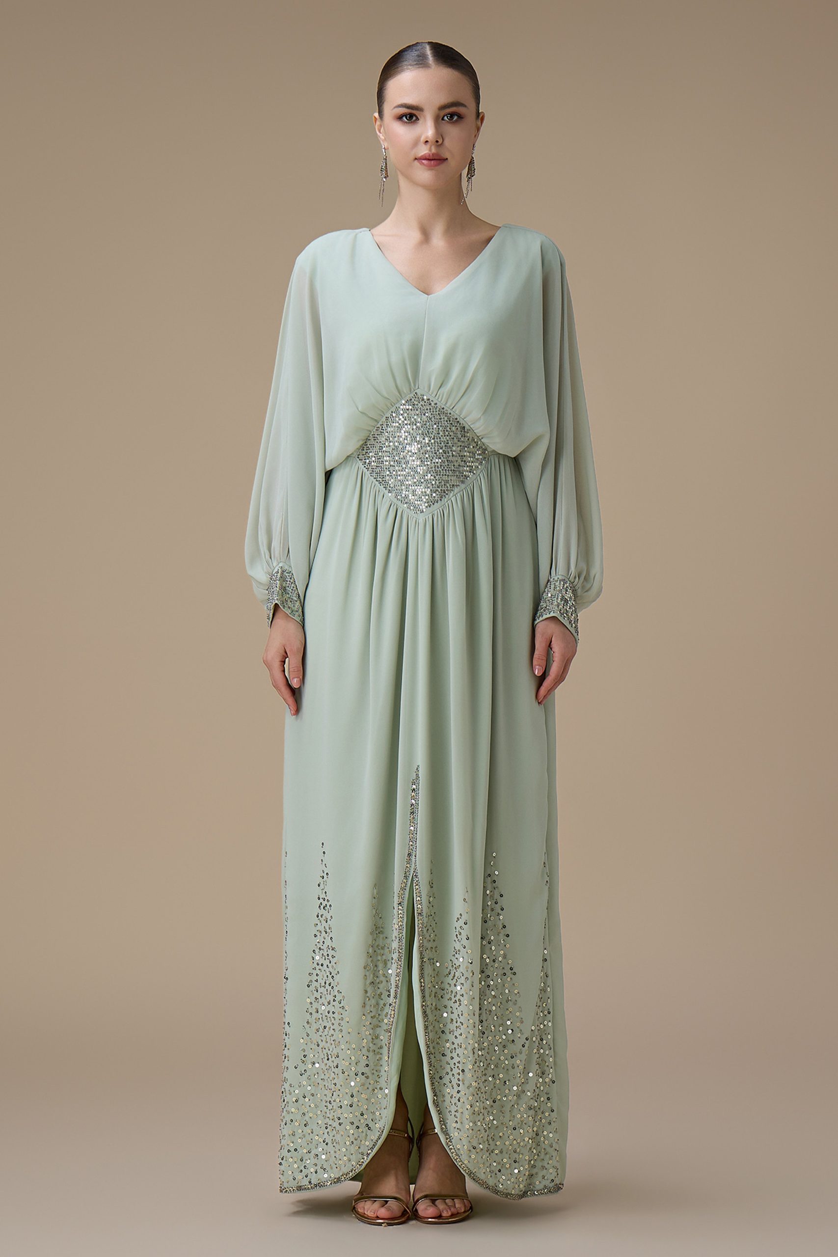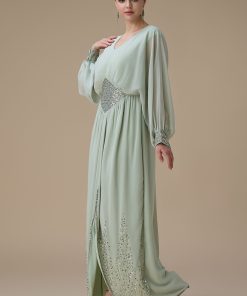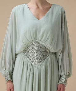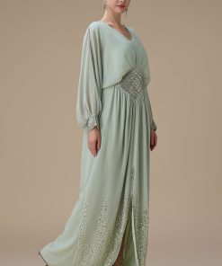نوع القصة: جلابية شيفون طويلة اخضر فاتح بتطريز كريستالي وقصة أنيقة بأكمام طويلة وياقة V –