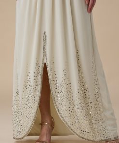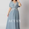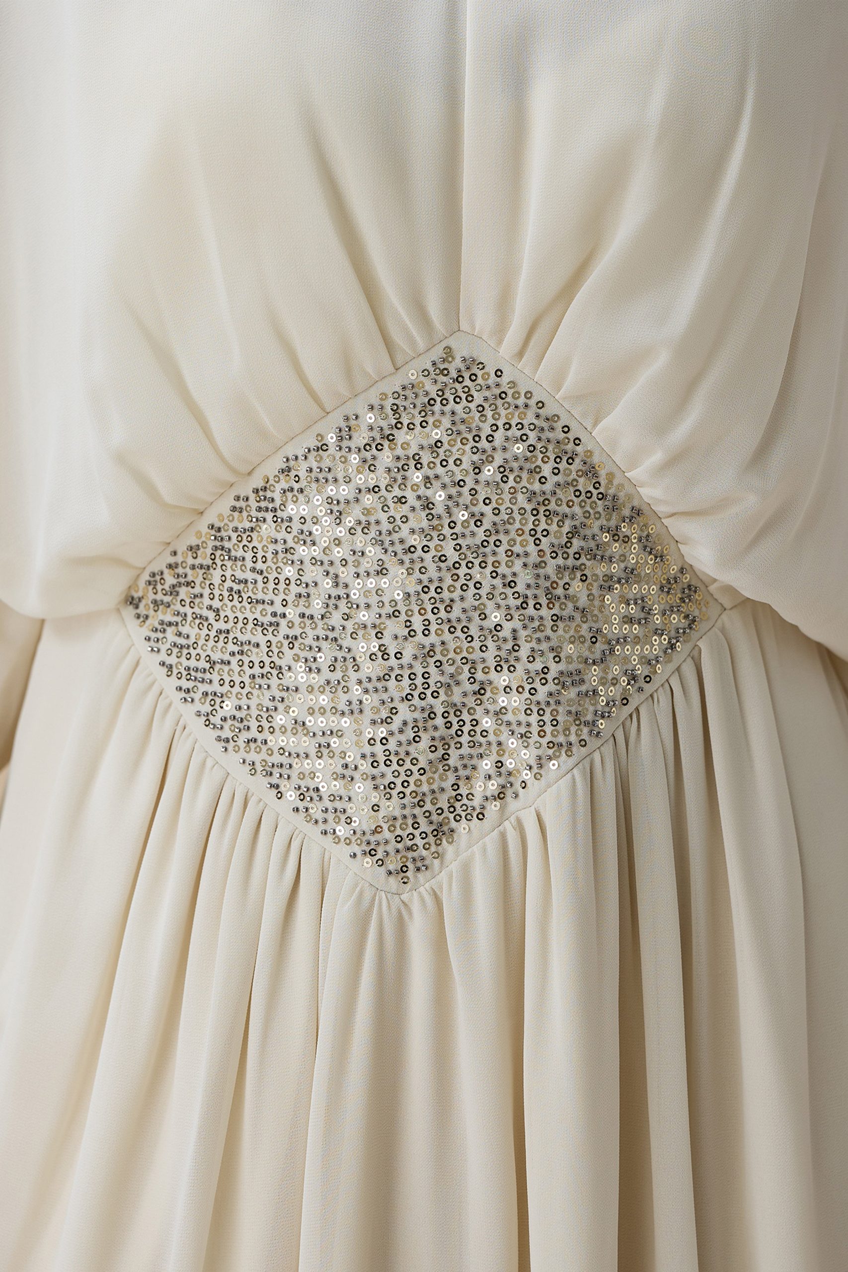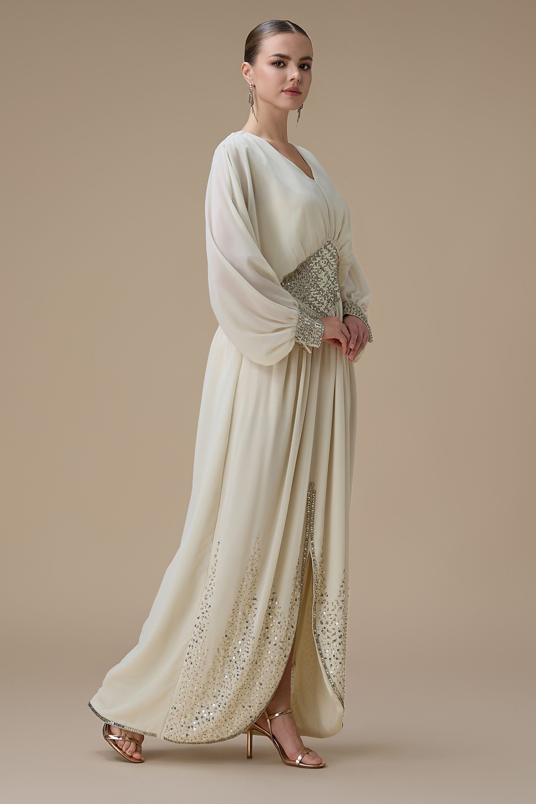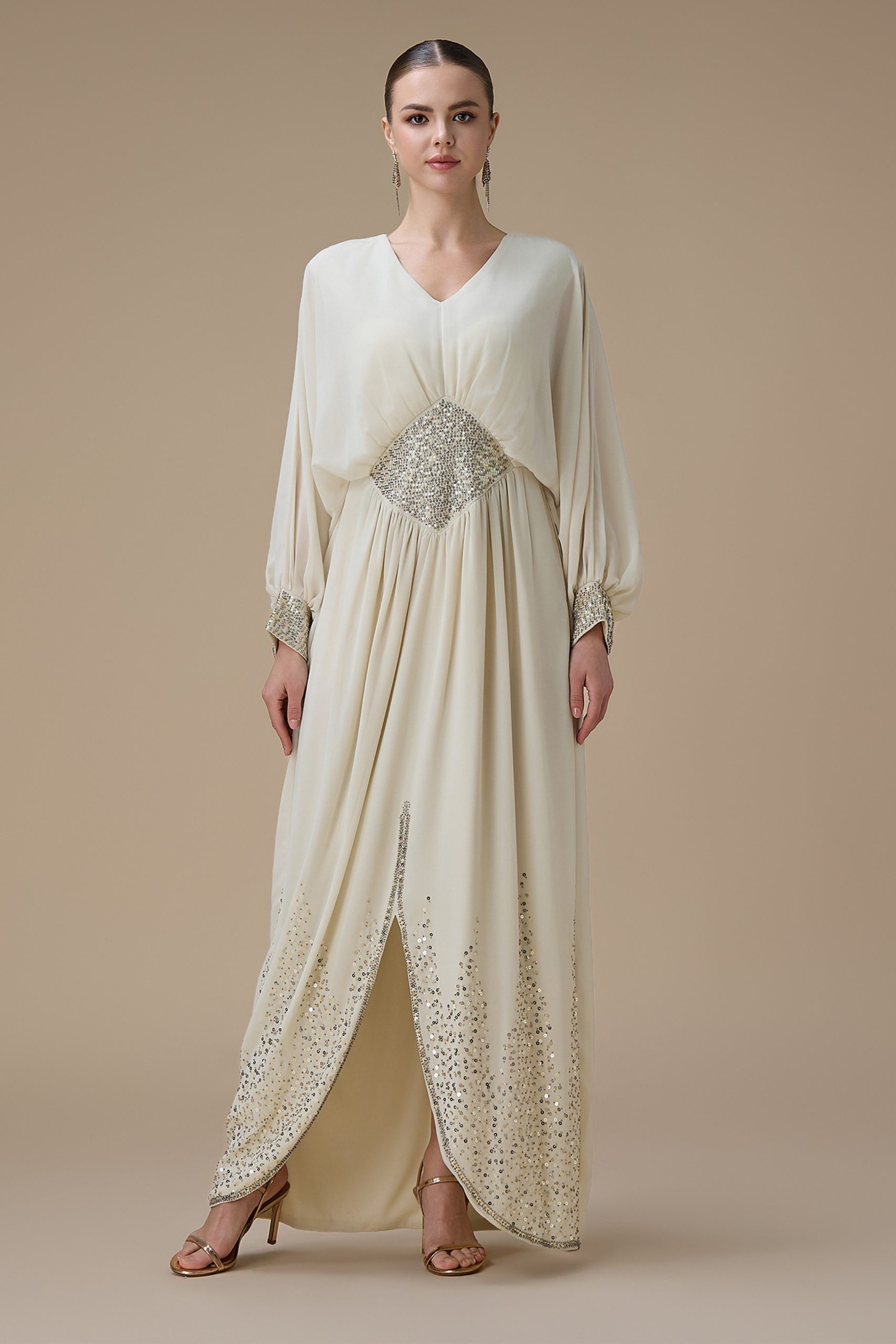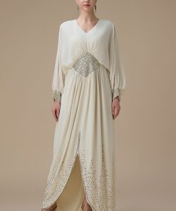 نوع القصة: جلابية شيفون طويلة سكري بتطريز كريستالي وقصة أنيقة بأكمام طويلة وياقة V –