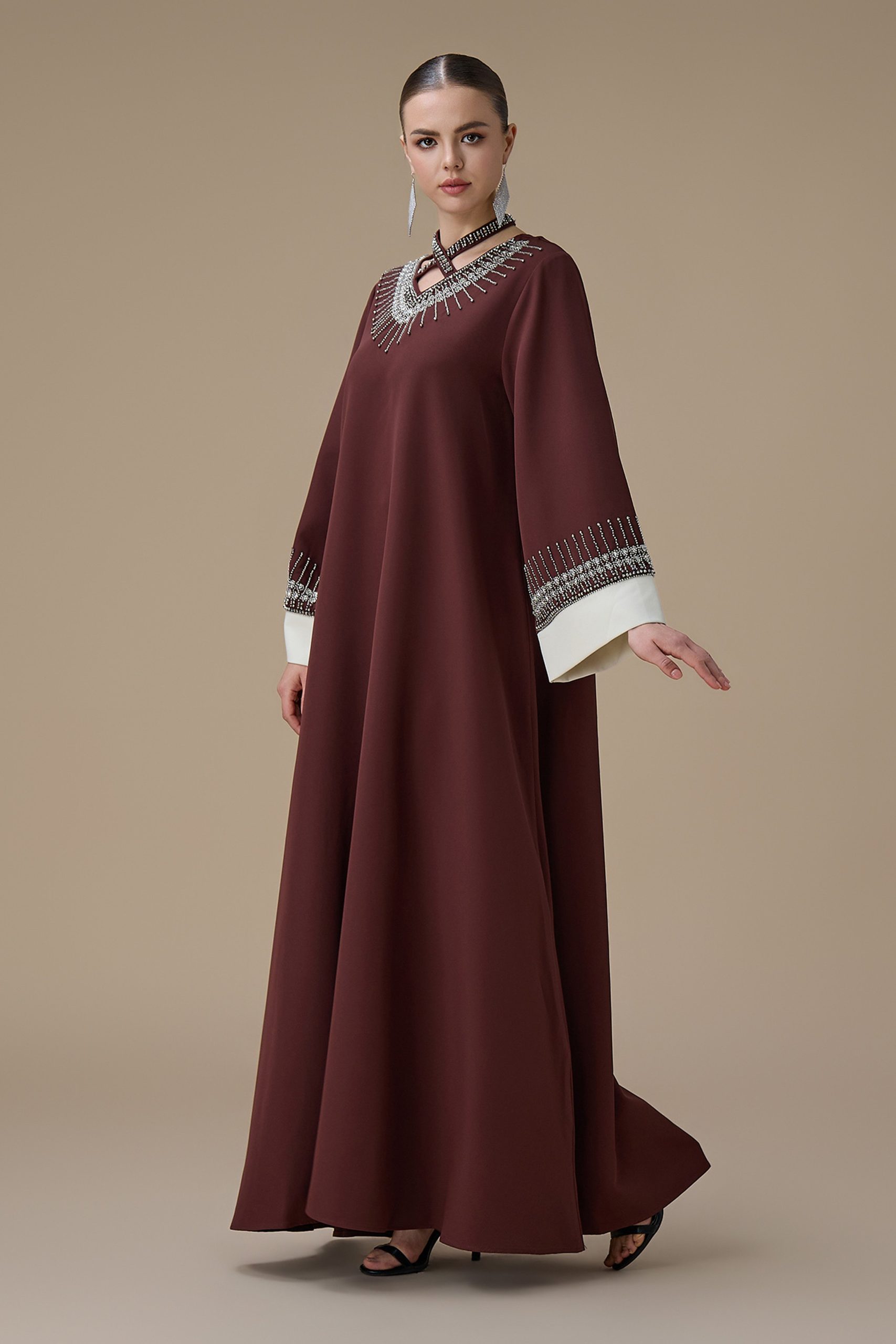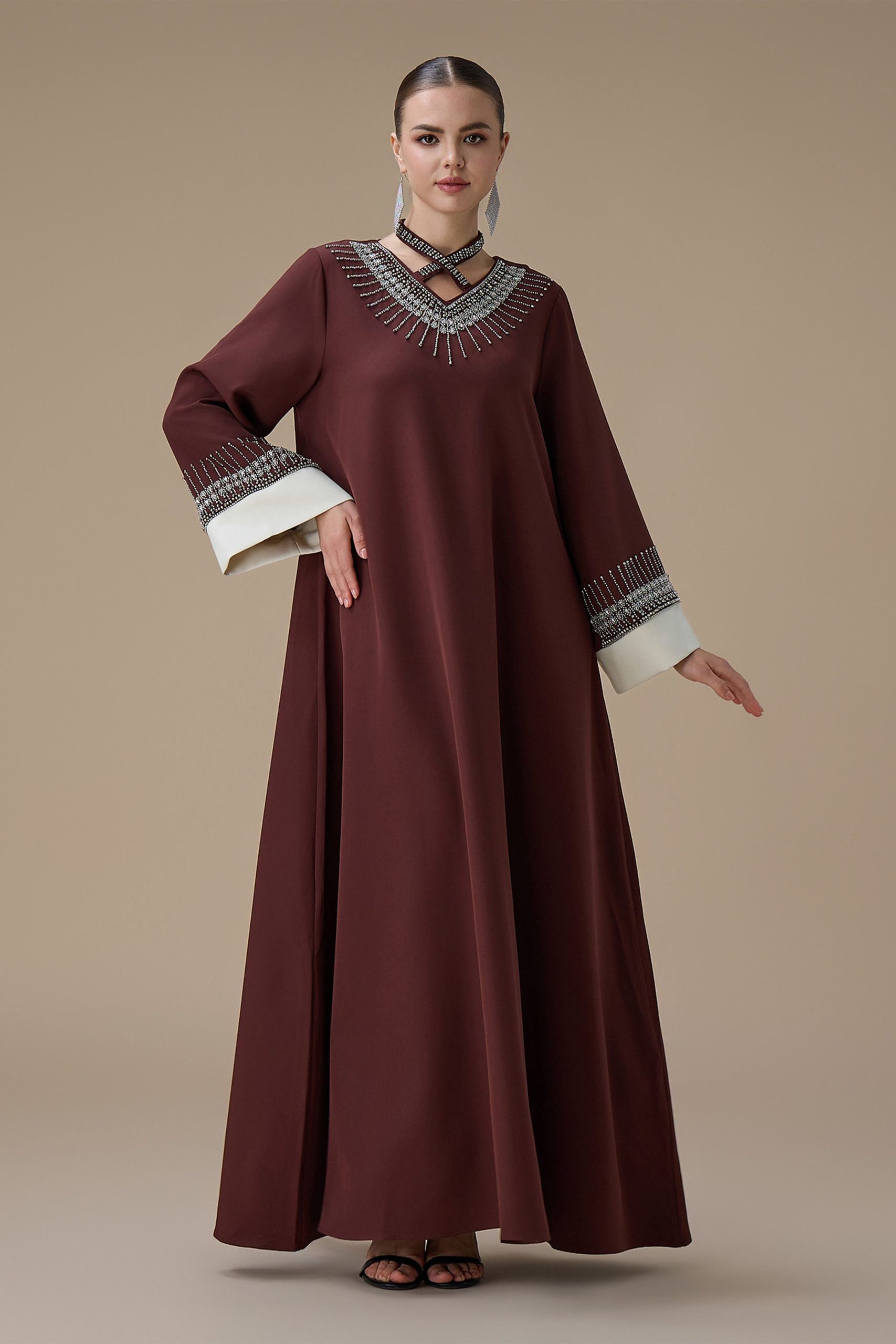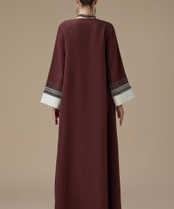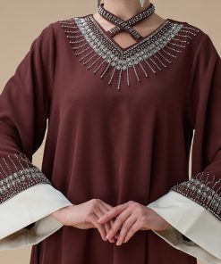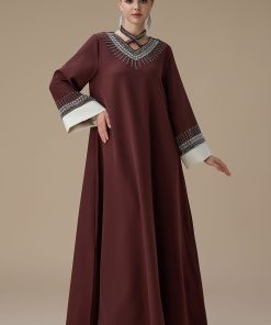 نوع القصة: جلابية طويلة بني بتطريز انيق بياقة متقاطعة وأكمام طويلة –